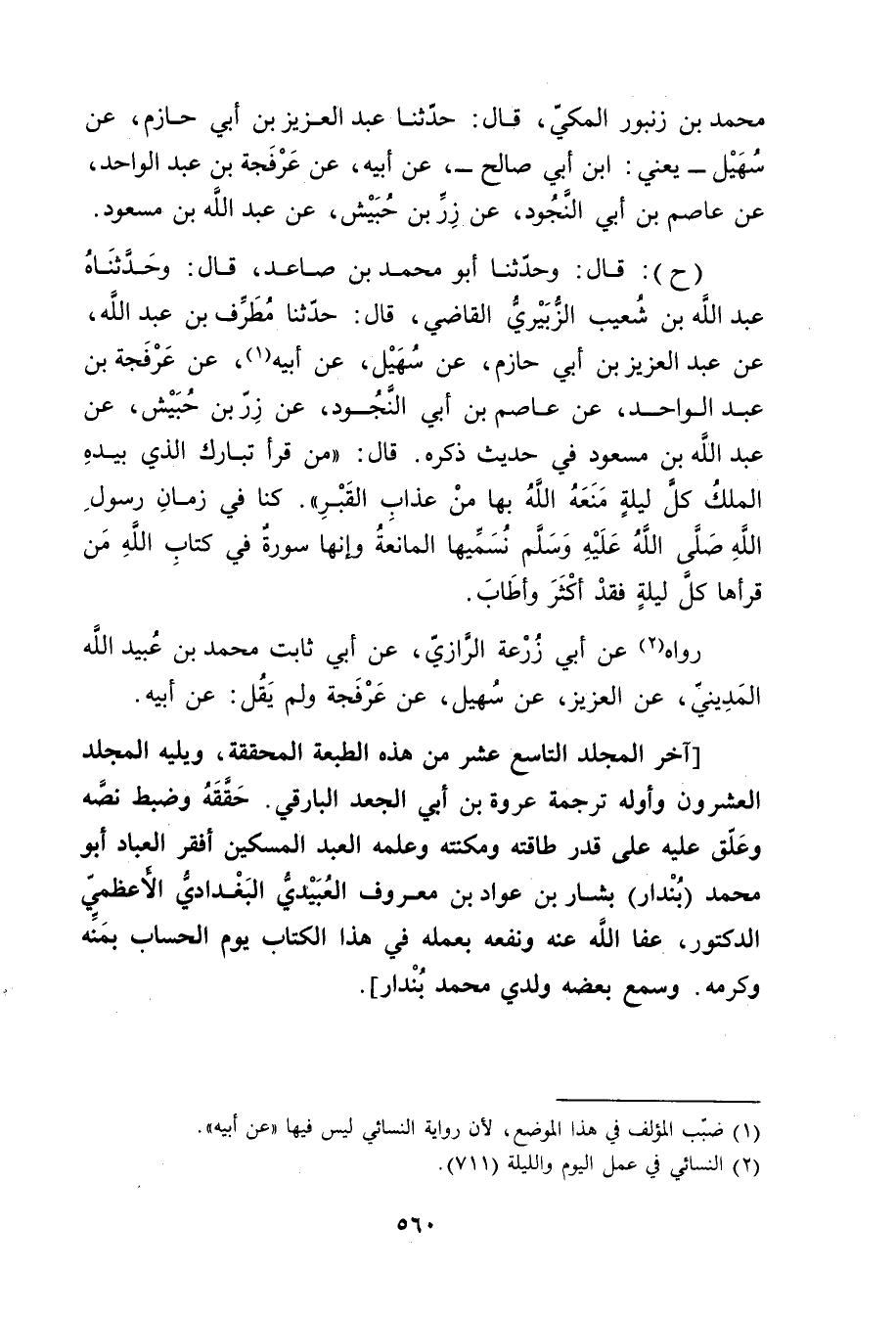 مُحَمَّدُ بْنُ زُنْبُورٍ الْمَكِّيُّ، قال: حَدَّثَنَا عَبْدُ الْعَزِيزِ بْنُ أَبي حَازِمٍ، عَنْ سُهَيْلٍ، يَعْنِي: ابْنَ أَبي صَالِحٍ، عَن أَبِيهِ، عَنْ عَرْفَجَةَ بْنِ عَبْدِ الْوَاحِدِ، عَنْ عَاصِمِ بْنِ أَبي النَّجُودِ، عَنْ زَرِّ بْنِ حُبَيْشٍ، عَنْ عَبد اللَّهِ بْنِ مَسْعُودٍ.