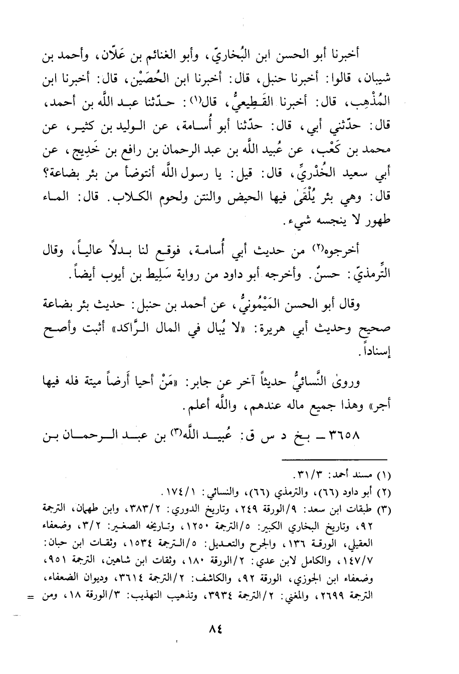 أَخْبَرَنَا أَبُو الْحَسَنِ بْنُ الْبُخَارِيِّ، وأبو الغنائم بْن علان، وأحمد بْنُ شَيْبَانَ، قَالُوا: أَخْبَرَنَا حَنْبَلُ، قال: أخبرنا ابن الحصين، قال: أخبرنا ابْنُ الْمُذْهِب، قال: أخبرنا القَطِيعِيّ، قال (1) : حَدَّثَنَا عَبد الله بْن أَحْمَدَ، قال: حَدَّثني أبي، قال: حَدَّثَنَا أَبُو أسامة، عن الْوَلِيدِ بْنِ كَثِيرٍ، عَنْ مُحَمَّدِ بْنِ كَعْبٍ، عَنْ عُبَيد اللَّهِ بْن عبد الرحمن بْن رافع بْنِ خُدَيْجٍ، عَن أَبِي سَعِيد الخُدْرِيّ، قال: قِيلَ: يَا رَسُولَ اللَّهِ أَنَتَوَضَّأُ مِنْ بِئْرِ بُضَاعَةَ؟ قال: وهي بئر فِيهَا الْحَيْضُ والنَّتِنُ ولُحُومُ الْكِلابِ. قال: الْمَاءُ طَهُورٌ لا يُنَجِّسُهُ شئ.