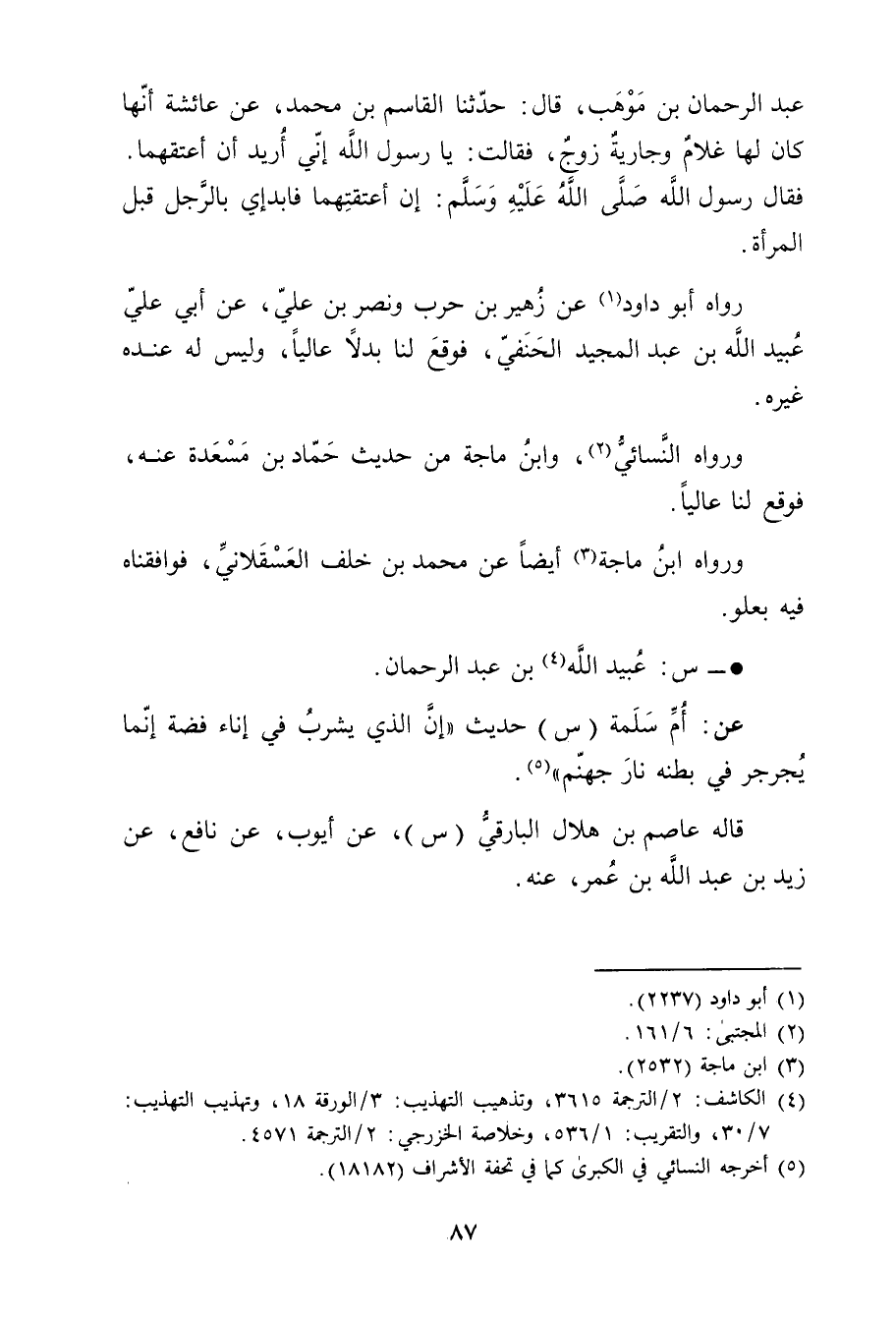 رَوَاهُ أَبُو دَاوُد (1) عَنْ زهير بْن حرب ونصر بْن عَلِي، عَن أَبِي علي عُبَيد اللَّهِ بْن عَبد المجيد الحنفي، فوقع لنا بدلا عاليا، وليس لَهُ عنده غيره.