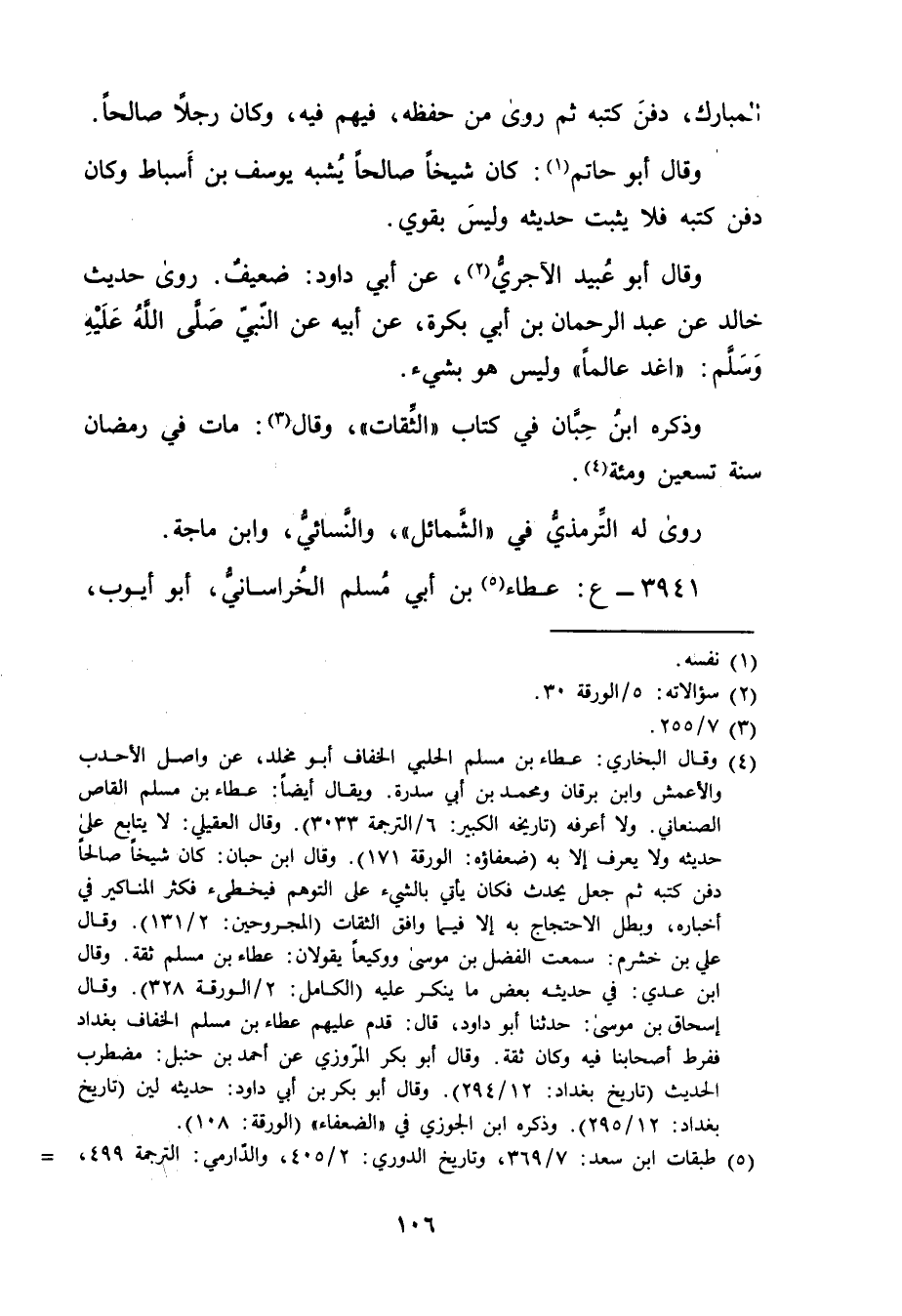 (4) وقَال البُخارِيُّ: عطاء بن مسلم الحلبي الخفاف أو مخلد، عن واصل الاحدب والأعمش وابن برقان ومحمد بن أَبي سدرة. ويُقال أيضا: عطاء بن مسلم القاص الصنعاني. ولا أعرفه (تاريخه الكبير: 6 / الترجمة 3033) . وَقَال العقيلي: لا يتابع عَلَى حديثه ولا يعرف إلا بِهِ (ضعفاؤه: الورقة 171) . وَقَال ابن حبان: كَانَ شيخا صالحا دفن كتبه ثم جعل يحدث فكان يأتي بالشئ على التوهم فيخطئ فكثر المناكير في أخبارة، وبطل الاحتجاج به إلا فيما وافق الثقات (المجروحين: 2 / 131) . وَقَال على بن خشرم: سمعت الفضل بن موسى ووكيعا يقولان: عطاء بن مسلم ثقة. وَقَال ابن عدي: في حديثة بعض ما ينكر عليه (الكامل: 2 / الورقة 328) . وَقَال إسحاق بن موسى: حَدَّثَنَا أبو داود، قال: قدم عليهم عطاء بن مسلم الخفاف بغداد ففرط أصحابنا فيه وكان ثقة. وَقَال أبو بكر المروزي عن أحمد بن حنبل: مضطرب الحديث (تاريخ بغداد: 12 / 294) . وَقَال أبو بكر بن أَبي داود: حديثه لين (تاريخ بغداد: 12 / 295) ، وذَكَره ابن الجوزي في "الضعفاء" (الورقة: 108) .