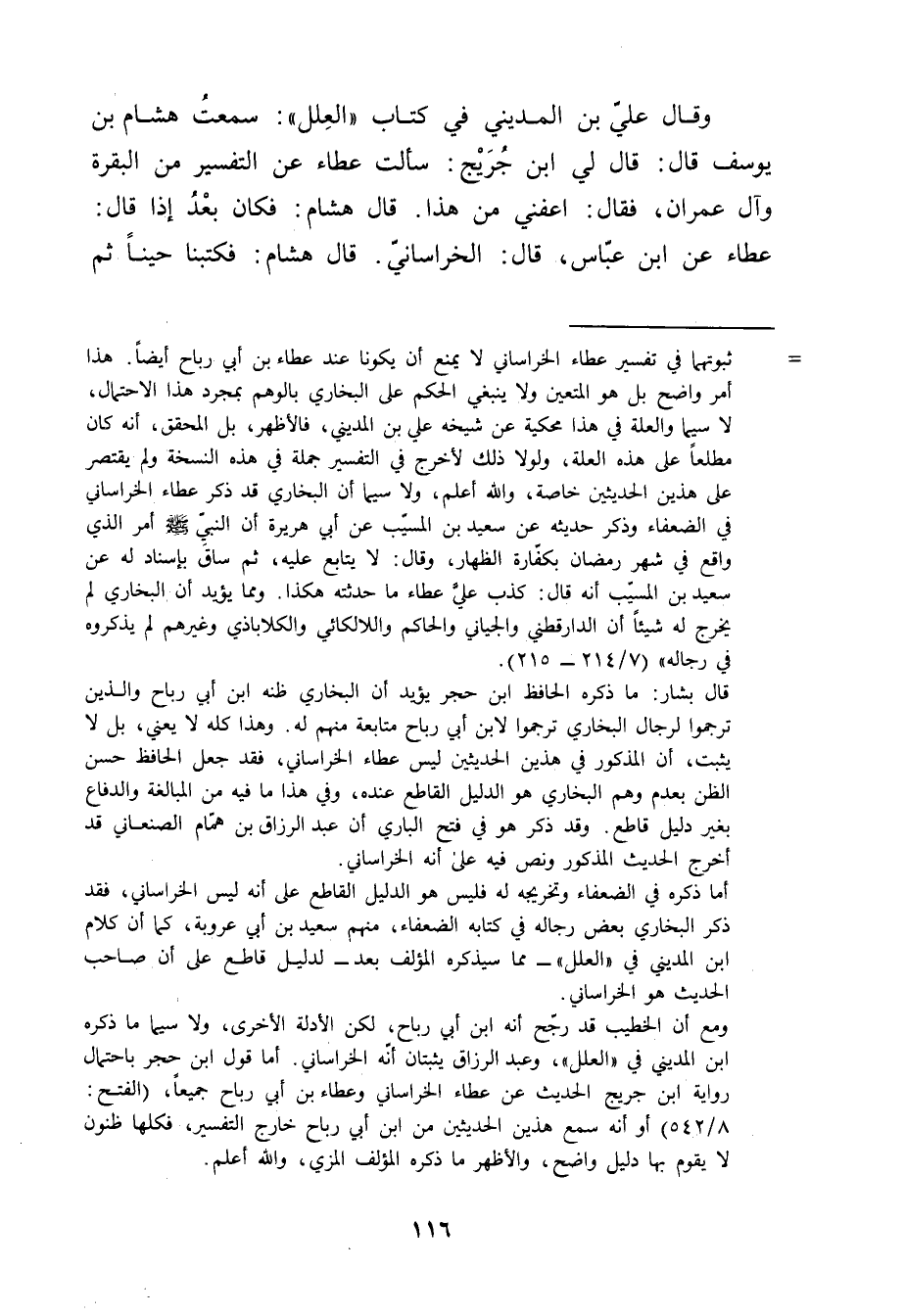 وَقَال علي بن المديني في كتاب"العلل": سمعت هشام بن يوسف قال: قال لي ابن جُرَيْج: سألت عطاء عن التفسير من البقرة وآل عِمْران، فقال: أعفني من هذا. قال هشام: فكان بعد إذا قال: عطاء عن ابن عباس، قال: الخراساني. قال هشام: فكتبنا حينا ثم