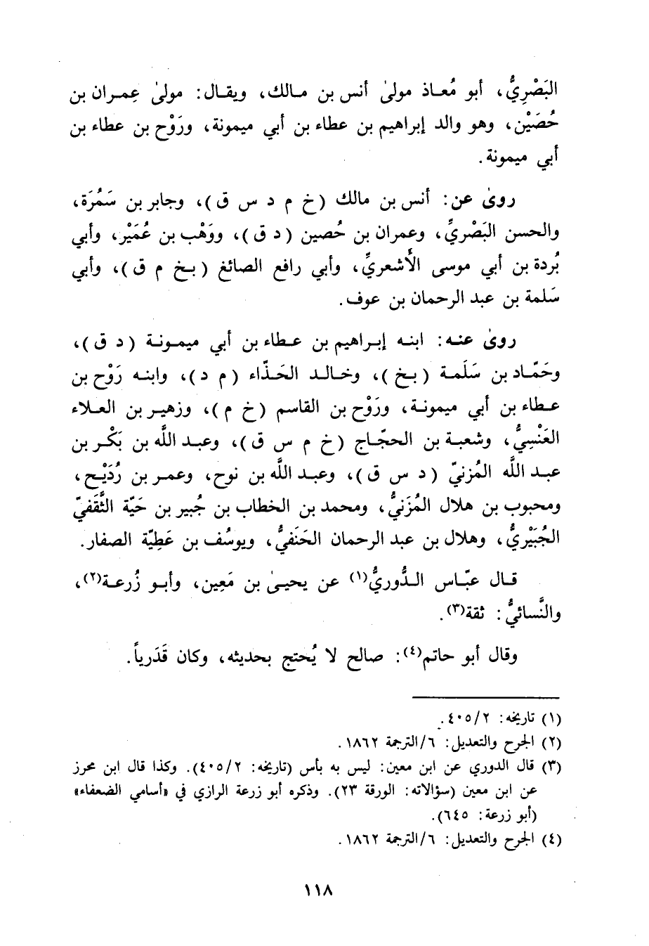 (3) قال الدوري عن ابن مَعِين: ليس به بأس (تاريخة 2 / 405) . وكذا قال ابن محرز عن ابن مَعِين (سؤالاته: الورقة 23) ، وذَكَره أَبُو زُرْعَة الرازي فِي "أسامي الضعفاء" (أبو زُرْعَة: 645) .