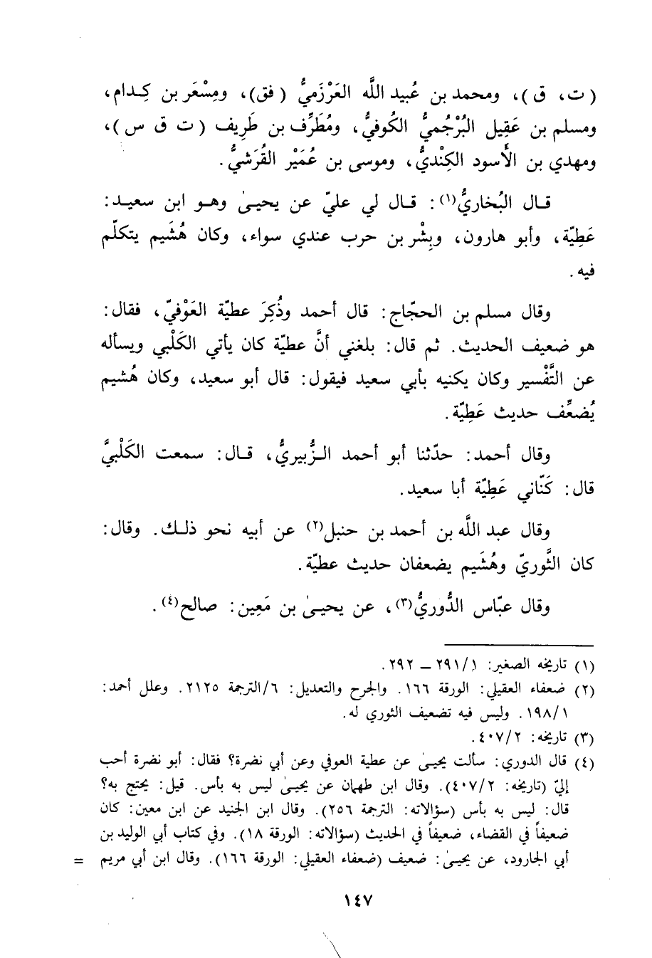 (4) قال الدوري: سألت يحيى عن عطية العوفي وعَن أبي نضرة؟ فقال: أَبُو نضرة أحب إلي (تاريخه: 2 / 407) . وَقَال ابن طهمان عَن يحيى ليس به بأس. قيل: يحتج به؟ قال: ليس به بأس (سؤالاته: الترجمة 256) . وَقَال ابن الجنيد عن ابن مَعِين: كان ضعيفا في القضاء، ضعيفا في الحديث (سؤالاته: الورقة 18) . وفي كتاب أبي الْوَلِيد بْن أَبي الجارود، عَنْ يحيى: ضعيف (ضعفاء العقيلي: الورقة 166) . وَقَال ابْن أَبي مريم =