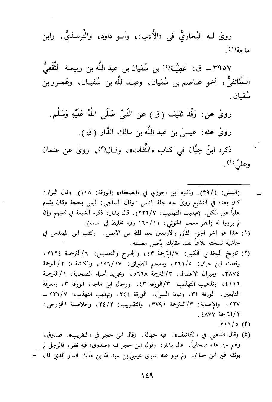 3957 - ق: عطية بن سفيان بن عَبْدِ اللَّهِ بن ربيعة الثقفي الطائفي (2) ، أخو عاصم بن سفيان، وعبد الله بن سفيان، وعَمْرو بن سُفْيَانَ.