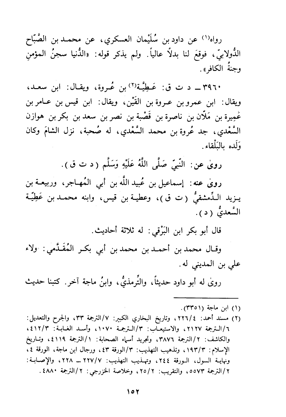 3960 - د ت ق: عطية بن عروة (2) ، ويُقال: ابن سعد، ويُقال: ابن عَمْرو بن عروة بن القين، ويُقال: ابن قيس بن عامر بن عميرة بن ملان بن ناصرة بن قصبة بن نصر بن سعد بن بكر بن هوازن السعدي، جد عروة بن محمد السعدي، لهُ صُحبَةٌ، نزل الشام وكان ولده بالبلقاء.