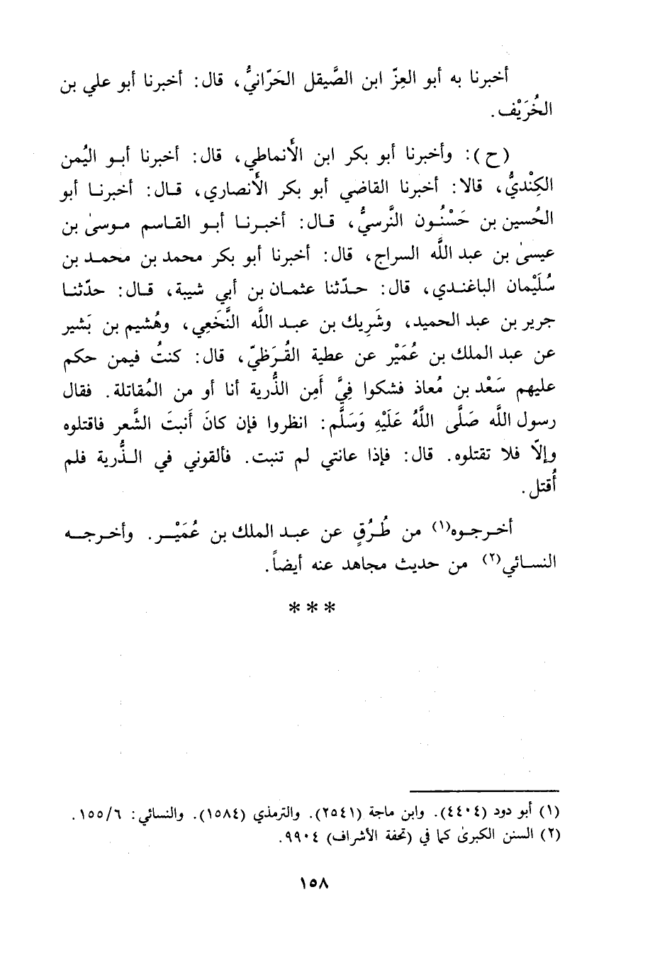 (ح) : وأَخْبَرَنَا أَبُو بَكْرِ بْنُ الأَنْمَاطِيِّ، قال: أَخْبَرَنَا أَبُو اليُمْنِ الْكُنْدِيُّ، قَالا: أَخْبَرَنَا الْقَاضِي أَبُو بكر الأَنْصارِيّ، قال: أخبرنا أَبُو الحسين بْن حسنون النرسي، قال: أَخْبَرَنَا أَبُو القاسم موسى بْن عيسى بْن عَبْدِ اللَّهِ السَّرَّاجُ، قال: أخبرنا أَبُو بكر مُحَمَّد بْن مُحَمَّد بْن سُلَيْمان الباغندي، قال: حَدَّثَنَا عثمان بْن أَبي شَيْبَة، قال: حَدَّثَنَا جَرِيرُ بْنُ عَبْدِ الْحَمِيدِ، وشَرِيك بْن عَبْد اللَّهِ النخعي، وهُشَيْمُ بْنُ بَشِيرٍ عَنْ عَبْدِ الْمَلِكِ بْنِ عُمَير عَنْ عَطِيَّةَ الْقُرَظِيِّ، قال: كُنْتُ فِيمَنْ حَكَمَ عَلَيْهِمْ سَعْدُ بْنُ مُعَاذٍ فَشَكُّوا فِيَّ أَمِنَ الذُّرِّيَّةِ أَنَا أَوْ مِنَ الْمُقَاتِلَةِ. فَقال رَسُولُ اللَّهِ صلى الله عليه وسلم: انْظُرُوا فَإِنْ كَانَ أَنْبَتَ الشَّعْرَ فَاقْتُلُوهُ وإِلا فَلا تَقْتُلُوهُ. قال: فَإِذَا عَانَتِي لَمْ تَنْبُتْ. فَأَلْقُونِي فِي الذُّرِّيَّةِ فَلَمْ أُقْتَلْ.