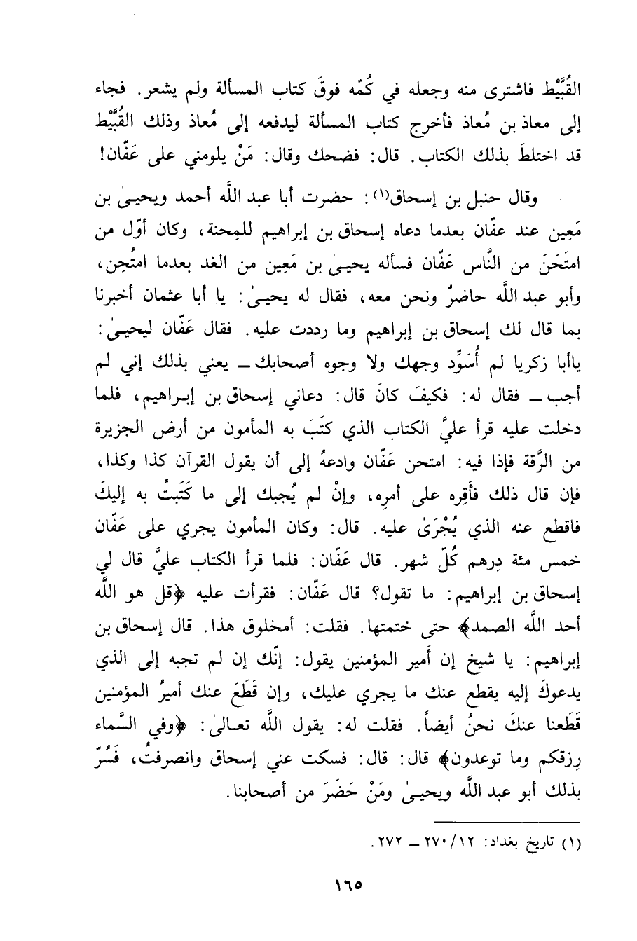 وَقَال حنبل بن إسحاق (1) : حضرت أبا عبد الله أحمد ويحيى بن مَعِين عند عفان بعدما دعاه إسحاق بن إبراهيم للمحنة، وكان أول من امتحن من الناس عفان فسأله يحيى بن مَعِين من الغد بعدما امتحن، وأبو عبد الله حاضر ونحن معه، فقال له يحيى: يا أبا عثمان أخبرنا بما قال لك إسحاق بن إبراهيم وما رددت عليه. فقال عفان ليحيى: يا أبا زكريا لم أسود وجهك ولا وجوه أصحابك، يعني بذلك إني لم أجب - فقال له: فكيف كان قال: دعاني إسحاق بن إبراهيم، فلما دخلت عليه قرأ علي الكتاب الذي كتب به المأمون من أرض الجزيرة من الرقة فإذا فيه: امتحن عفان وادعه إلى أن يقول القرآن كذا وكذا، فإن قال ذلك فأقره على أمره، وإن لم يجبك إلى ما كتبت به إليك فاقطع عنه الذي يجرى عليه.