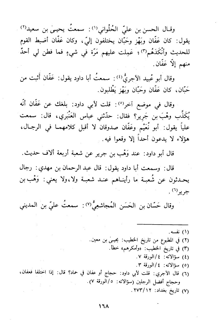 (6) قال الآجري: قلتُ لأبي داود: حجاج أو عفان في حماد؟ قال: إذا اختلفا فعفان، وحجاج أفضل الرجلين (سؤالاته: 5 / الورقة 7) .