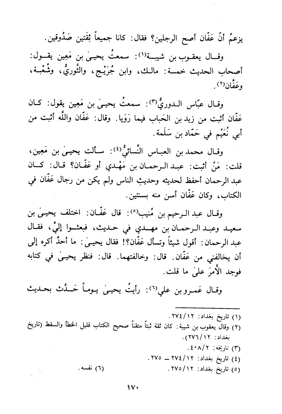 وَقَال عَباس الدُّورِيُّ (3) : سمعت يحيى بْن مَعِين يقول: كان عفان أثبت من زيد بن الحباب فيما رويا. وَقَال: عفان والله أثبت من أبي نعيم في حماد بن سلمة.