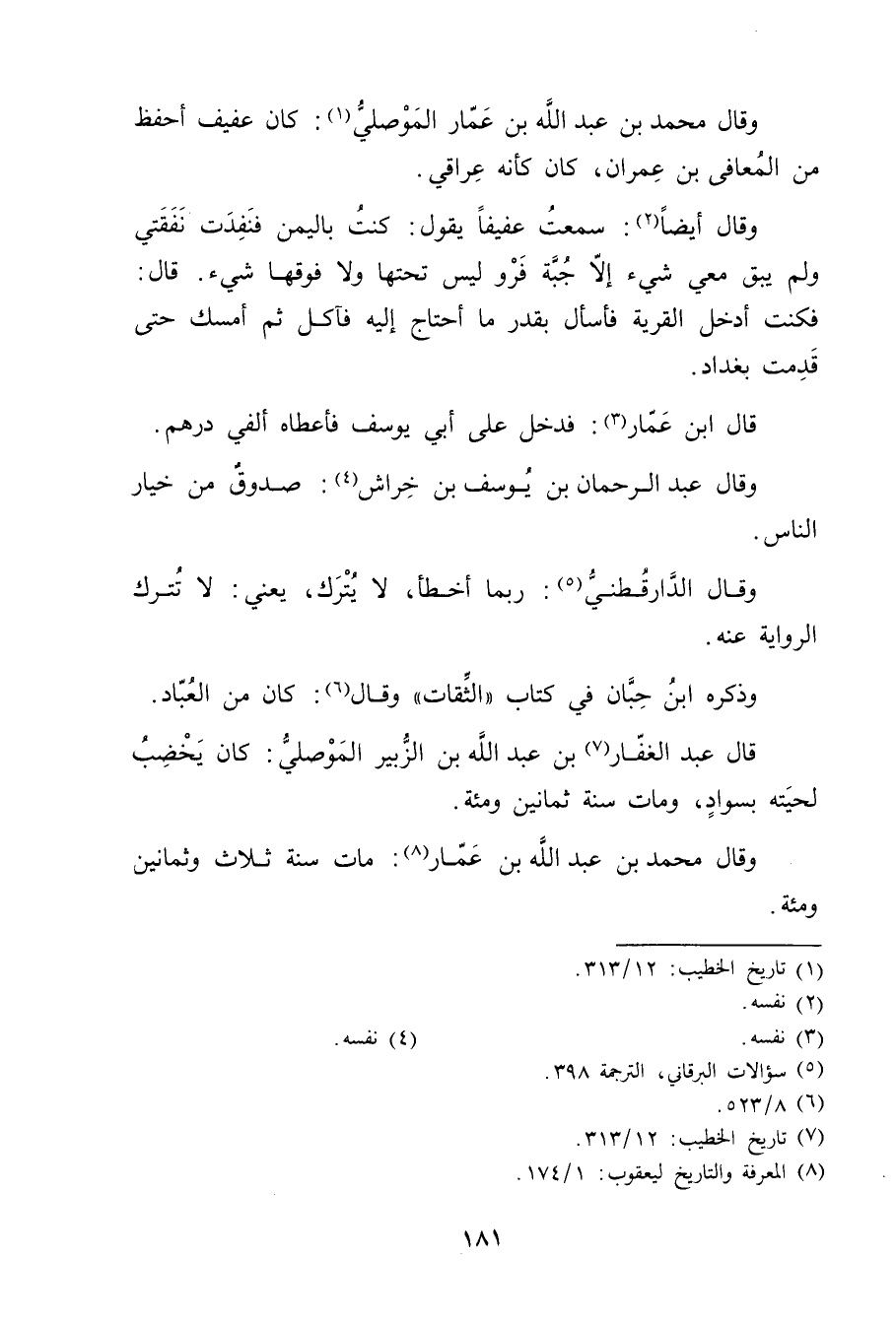 وَقَال مُحَمَّد بْن عَبْد اللَّهِ بن عمار الموصلي (1) : كان عفيف أحفظ من المعافى بن عِمْران، كان كأنه عراقي.