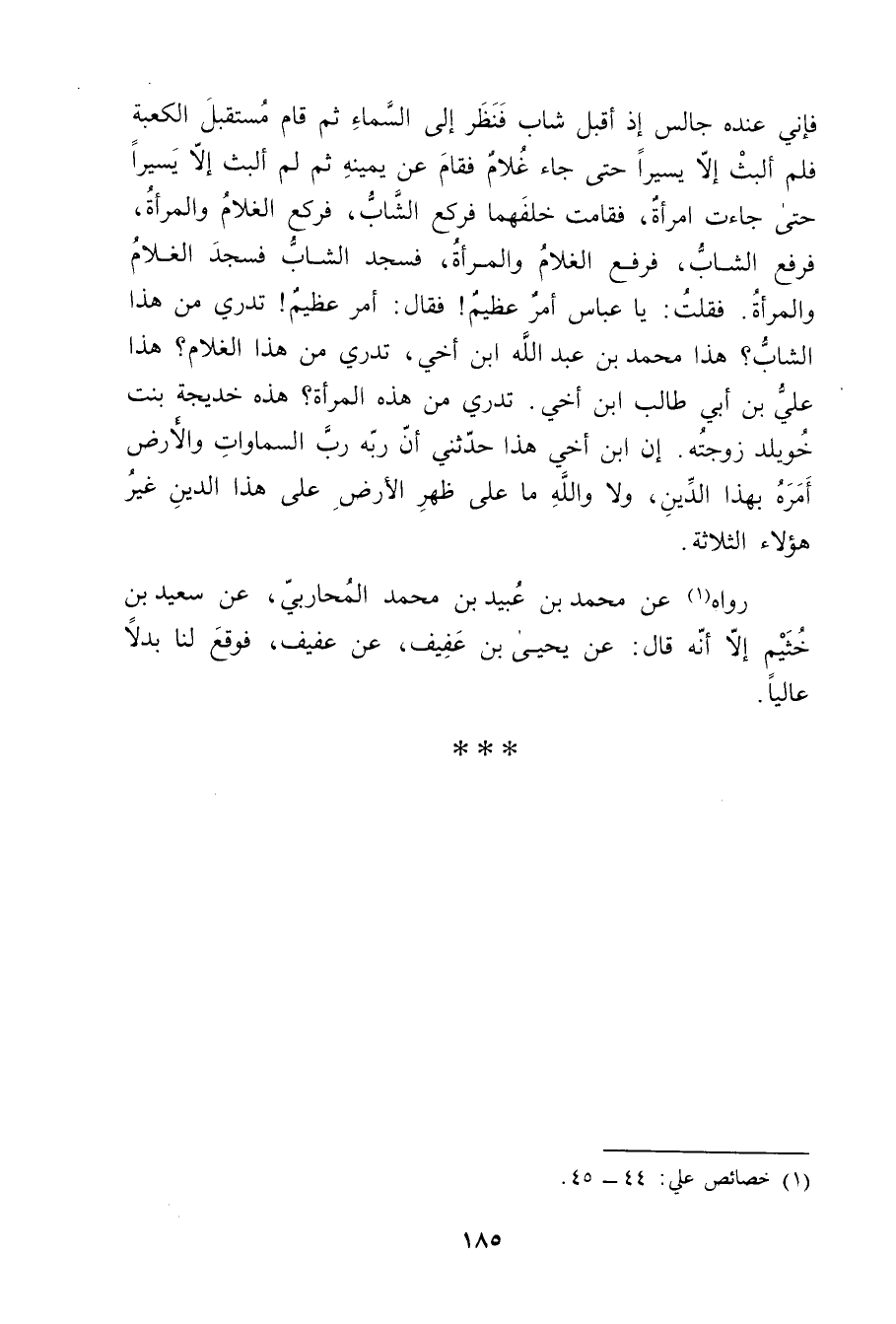 فإني عنده جالس إذ أقبل شاب فنظر إلى السماء ثم قام مستقبل الكعبة فلم ألبث إلا يسيرا حتى جاء غلام فقام عن يمينه ثم لم ألبث إلا يسيرا حتى جاءت امرأة، فقامت خلفهما فركع الشاب، فركع الغلام والمرأة، فرفع الشاب، فرفع الغلام والمرأة، فسجد الشاب فسجد الغلام والمرأة. فقلت: يا عباس أمر عظيم! فقال: أمر عظيم! تدري من هذا الشاب؟ هذا محمد بن عبد الله بن أخي، تدري من هذا الغلام؟ هذا علي بن أَبي طالب ابن أخي. تدري من هذه المرأة؟ هذه خديجة بنت خويلد زوجته. إن ابن أخي هذا حدثني أن ربه رب السماوات والأرض أمره بهذا الدين، ولا والله ما على ظهر الأرض على هذا الدين غير هؤلاء الثلاثة.