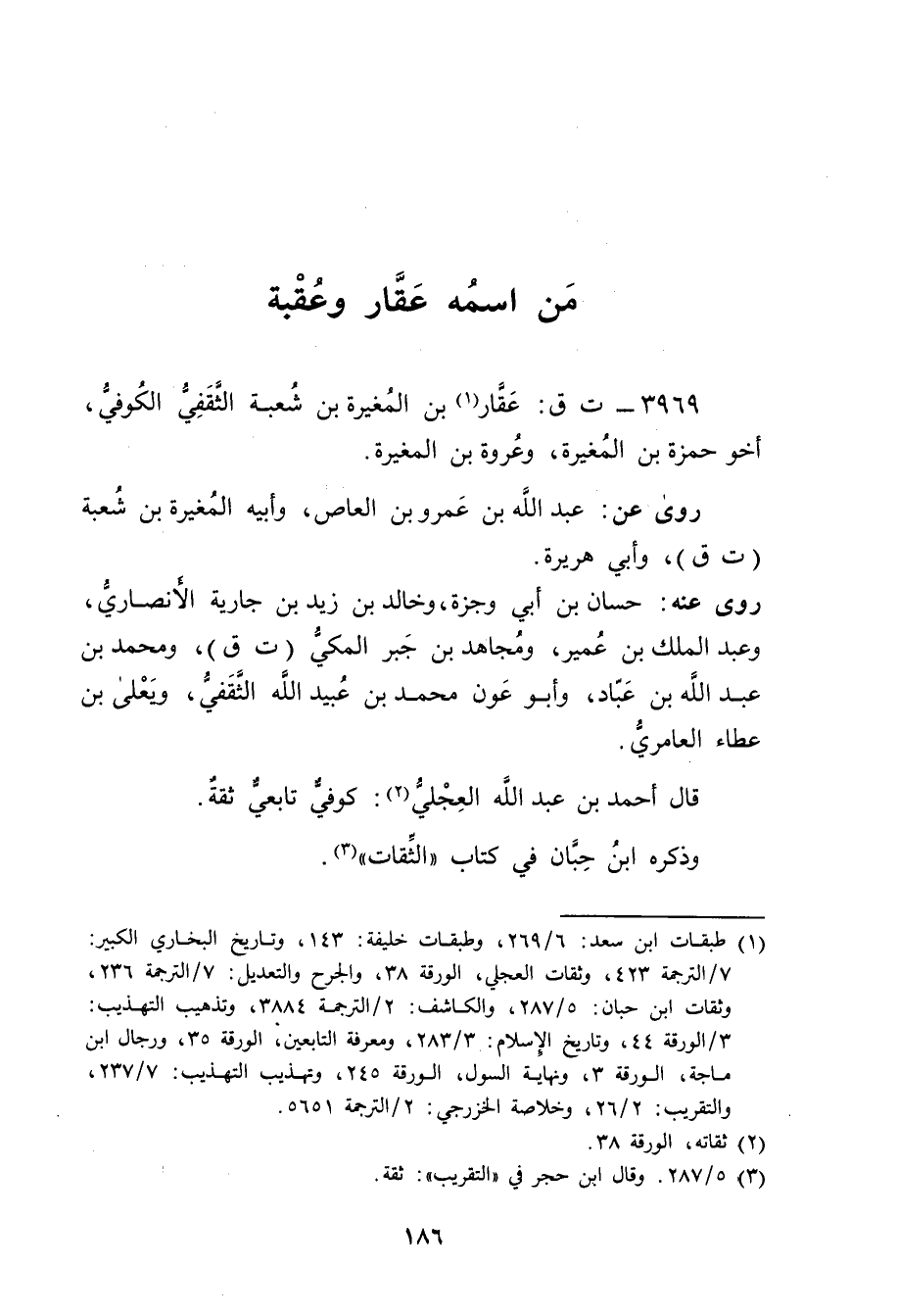 3969 - ت ق: عقار بن المغيرة بن شعبة الثقفي الكوفي (1) ، أخو حمزة بن المغيرة، وعروة بن المغيرة.
