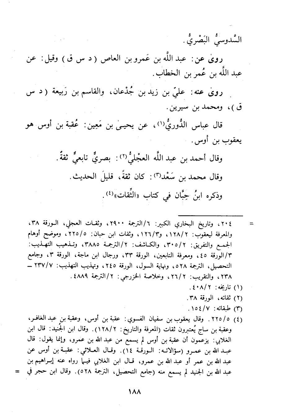 (4) 5 / 225. وَقَال يعقوب بن سفيان الفسوي: عقبة بن أوس، وعقبة بن عبد الغافر، وعقبة بن ساج يعتبرون ثقات (المعرفة والتاريخ: 2 / 128) . وَقَال ابن الجنيد: قال ابن الغلابي: يزعمون أن عقبة بن أوس لم يسمع من عبد الله بن عَمْرو، وإنما يقول: قال عبد الله بن عَمْرو (سؤالاته: الورقة 14) . وَقَال العلائي: عقبة بن أوس عن عبد الله بن عُمَر أو عبد الله بن عَمْرو، قال ابن الغلابي فيما رواه عنه إبراهيم بن عبد الله بن الجنيد لم يسمع منه (جامع التحصيل، الترجمة 528) . وَقَال ابن حجر في =