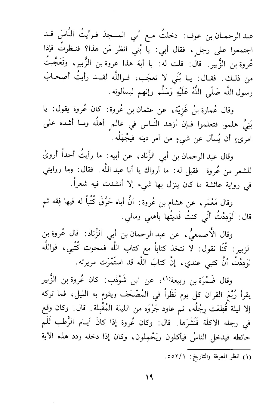 وَقَال الأَصْمَعِيّ، عن عبد الرَّحْمَنِ بْنُ أَبي الزناد: قال عروة بن الزبير: كنا نقول: لا نتخذ كتابا مع كتاب الله فمحوت كتبي، فوالله لوددت أن كتبي عندي، إن كتاب الله قد استمرت مريرته.