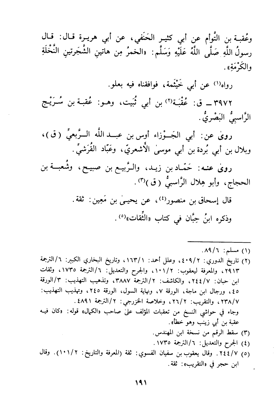 (2) تاريخ الدوري: 2 / 409، وعلل أحمد: 1 / 163، وتاريخ البخاري الكبير: 6 / الترجمة 2913، والمعرفة ليعقوب: 2 / 101، والجرح والتعديل: 6 / الترجمة 1735، وثقات ابن حبان: 7 / 244، والكاشف: 2 / الترجمة 3887، وتذهيب التهذيب: 3 / الورقة 45، ورجال ابن ماجة: الورقة 7، ونهاية السول: الورقة 245، تهذيب التهذيب: 7 / 238، والتقريب: 2 / 26، وخلاصة الخزرجي: 2 / الترجمة 4891. وجاء في حواشي النسخ من تعقبات المؤلف على صاحب "الكمال" قوله: كان فيه عقبة بن أَبي زينب وهو خطأ.