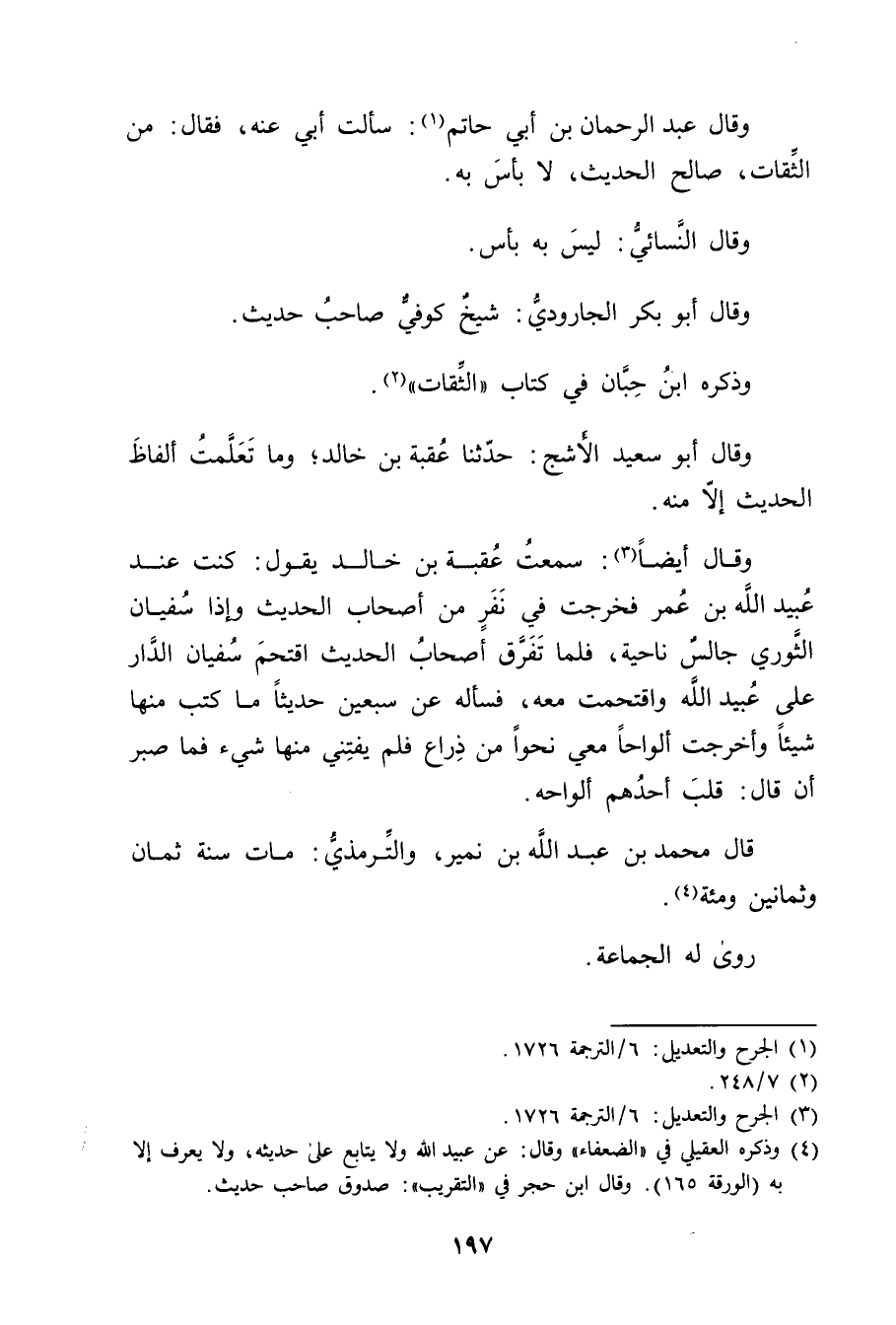 وَقَال أيضا (3) : سمعت عقبة بن خالد يقول: كنت عند عُبَيد الله بن عُمَر فخرجت في نفر من أصحاب الحديث وإذا سفيان الثوري جالس ناحية، فلما تفرق أصحاب الحديث اقتحم سفيان الدار على عُبَيد الله واقتحمت معه، فسأله عن سبعين حديثا ما كتب منها شيئا وأخرجت ألواحا معي نحوا من ذراع فلم يفتني منها شيء فما صبر أن قال: قلب أحدهم ألواحه.