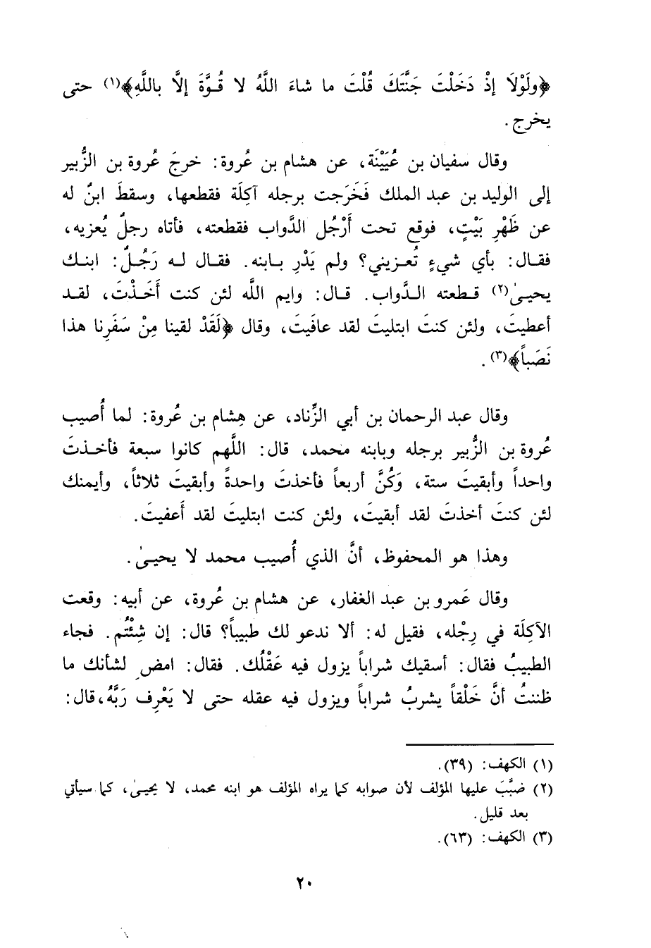 وَقَال سفيان بن عُيَيْنَة، عن هشام بن عروة: خرج عروة بن الزبير إلى الوليد بن عبد الملك فخرجت برجله آكلة فقطعها، وسقط ابن له عن ظهر بيت، فوقع تحت أرجل الدواب فقطعته، فأتاه رجل يعزيه، فقال: بأي شيء تعزيني؟ ولم يدر بابنه. فقال له رجل: ابنك يحيى (2) قطعته الدواب. قال: وأيم الله لئن كنت أخذت، لقد أعطيت، ولئن كنت ابتليت لقد عافيت، وَقَال {لقد لقينا من سفرنا هذا نصبا) {3) .