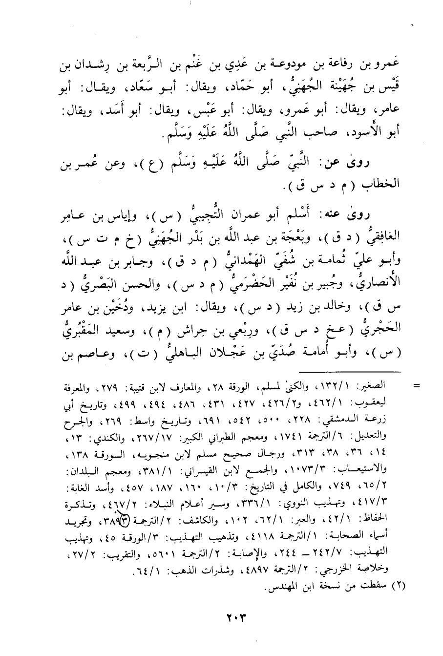 = الصغير: 1 / 132، والكنى لمسلم، الورقة 28، والمعارف لابن قتيبة: 279، والمعرفة ليعقوب: 1 / 462، و2 / 426، 427، 431، 486، 494، 499، وتاريخ أبي زرعة الدمشقي: 228، 500، 542، 691، وتاريخ واسط: 269، والجرح والتعديل: 6 / الترجمة 1741، ومعجم الطبراني الكبير: 17 / 267، والكندي: 13، 14، 36، 38، 313، ورجال صحيح مسلم لابن منجويه، الورقة 138، والاستيعاب: 3 / 1073، والجمع لابن القيسراني: 1 / 381، ومعجم البلدان: 2 / 65، 749، والكامل في التاريخ: 3 / 10، 160، 187، 457، وأسد الغابة: 3 / 417، وتهذيب النووي: 1 / 336، وسير أعلام النبلاء: 2 / 467، وتذكرة الحفاظ: 1 / 42، والعبر: 1 / 62، 102، والكاشف: 2 / الترجمة 3893، وتجريد أسماء الصحابة: 1 / الترجمة 4118، وتذهيب التهذيب: 3 / الورقة 45، وتهذيب التهذيب: 7 / 242 - 244، والاصابة: 2 / الترجمة 5601، والتقريب: 2 / 27، وخلاصة الخزرجي: 2 / الترجمة 4897، وشذرات الذهب: 1 / 64.