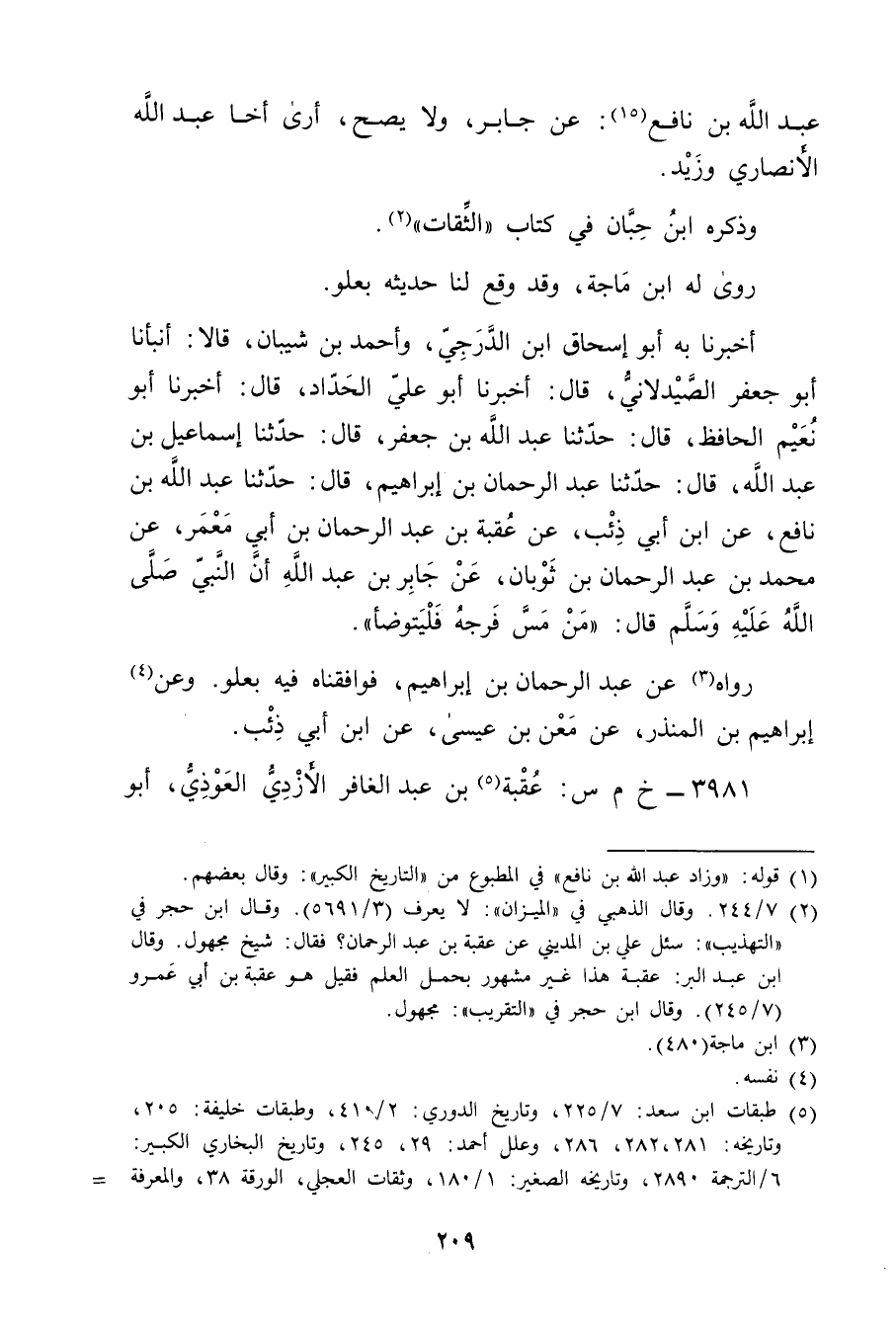 أَخْبَرَنَا بِهِ أَبُو إِسْحَاقَ ابْنُ الدَّرَجِيِّ، وأَحْمَدُ بْنُ شَيْبَانَ، قالا: أَنْبَأَنَا أَبُو جَعْفَرٍ الصَّيْدَلانِيُّ، قال: أَخْبَرَنَا أَبُو عَلِيّ الحداد، قال: أَخْبَرَنَا أبو نعيم الحافظ، قال: حَدَّثَنَا عَبْد الله بْن جعفر، قال: حَدَّثَنَا إسماعيل بْن عَبْدِ اللَّهِ، قال: حَدَّثَنَا عَبْدُ الرَّحْمَنِ بْنِ إِبْرَاهِيمَ، قال: حَدَّثَنَا عَبْدُ الله بْن نَافِع، عَنِ ابْن أَبي ذِئْبٍ، عَنْ عُقْبَةَ بْنِ عبد الرحمن بن أَبي معمر، عَنْ مُحَمَّد بْن عبد الرحمن بْنِ ثَوْبَانَ، عَنْ جَابِرِ بْنِ عَبْدِ اللَّهِ أَنَّ النَّبِيَّ صَلَّى اللَّهُ عليه وسلم قال: من مَسَّ فَرْجَهُ فَلْيَتَوَضَّأْ.
