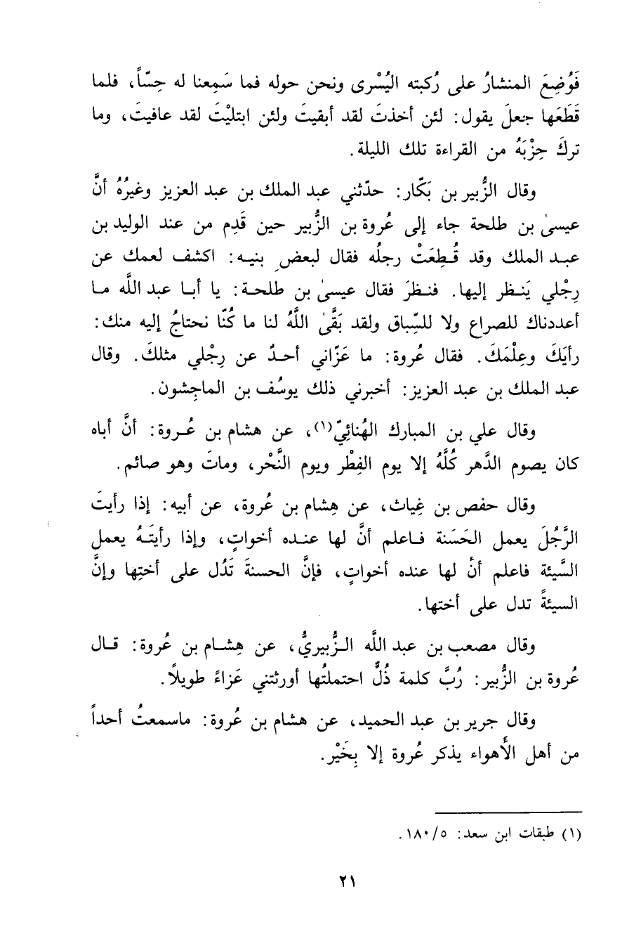 وَقَال الزبير بْن بكار: حَدَّثَنِي عبد الملك بْن عَبْد الْعَزِيزِ وغيره أن عيسى بن طلحة جاء إلى عروة بن الزبير حين قدم من عند الوليد بن عبد الملك وقد قطعت رجله فقال لبعض بنيه: اكشف لعمك عن رجلي ينظر إليها. فنظر فقال عيسى بن طلحة: يا أَبَا عَبْد اللَّهِ ما أعددناك للصراع ولا للسباق ولقد بقى الله لنا ما كنا نحتاج إليه منك: رأيك وعلمك. فقال عروة: ما عزاني أحد عن رجلي مثلك. وَقَال عبد الملك بن عبد العزيز: أخبرني ذلك يوسف بن الماجشون.