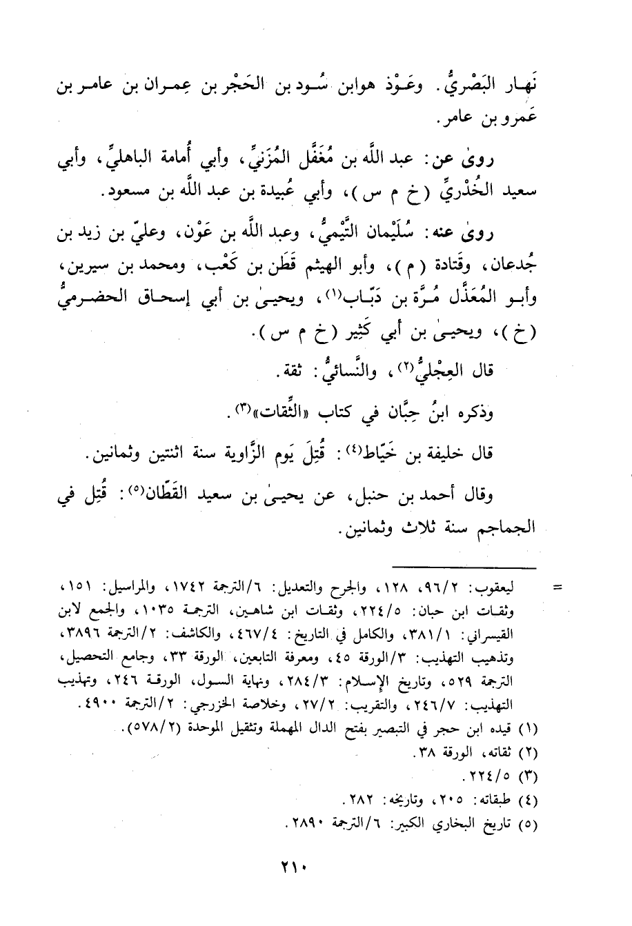 = ليعقوب: 2 / 96، 128، والجرح والتعديل: 6 / الترجمة 1742، والمراسيل: 151، وثقات ابن حبان: 5 / 224، وثقات ابن شاهين، الترجمة 1035، والجمع لابن القيسراني: 1 / 381، والكامل في التاريخ: 4 / 467، والكاشف: 2 / الترجمة 3896، وتذهيب التهذيب: 3 / الورقة 45، ومعرفة التابعين، الورقة 33، وجامع التحصيل، الترجمة 529، وتاريخ الاسلام: 3 / 284، ونهاية السول، الورقة 246، وتهذيب التهذيب: 7 / 246، والتقريب: 2 / 27، وخلاصة الخزرجي: 2 / الترجمة 4900.