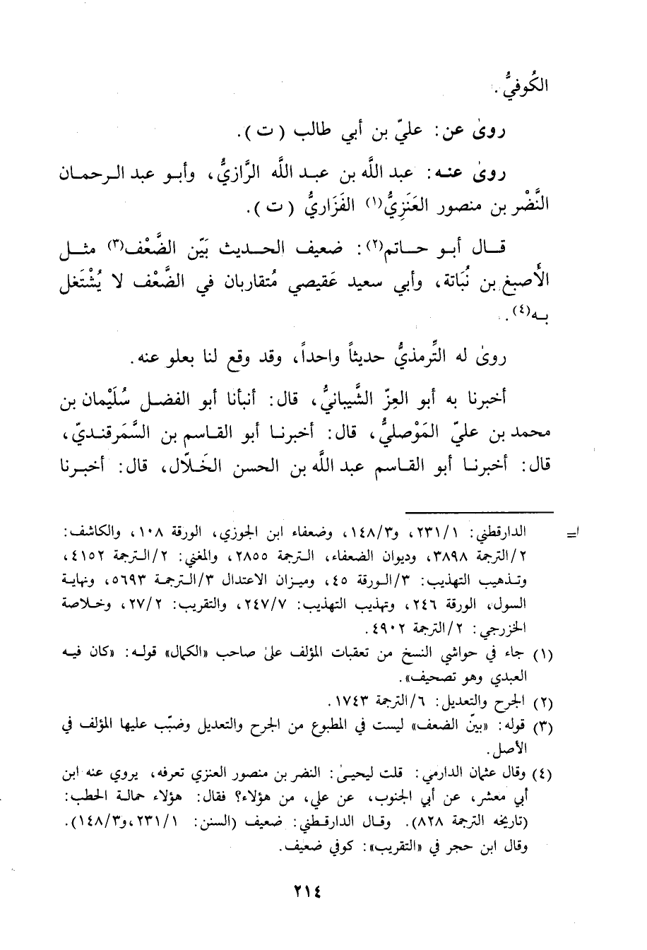 (4) وَقَال عثمان الدارمي: قلت ليحيى: النضر بن منصور العنزي تعرفه، يروي عنه ابن أَبي معشر، عَن أبي الجنوب: عن علي، من هؤلاء؟ فقال: هؤلاء حمالة الحطب: (تاريخه الترجمة 828) . وَقَال الدَّارَقُطْنِيُّ: ضعيف (السنن: 1 / 231، و3 / 148) . وَقَال ابن حجر في "التقريب": كوفي ضعيف.