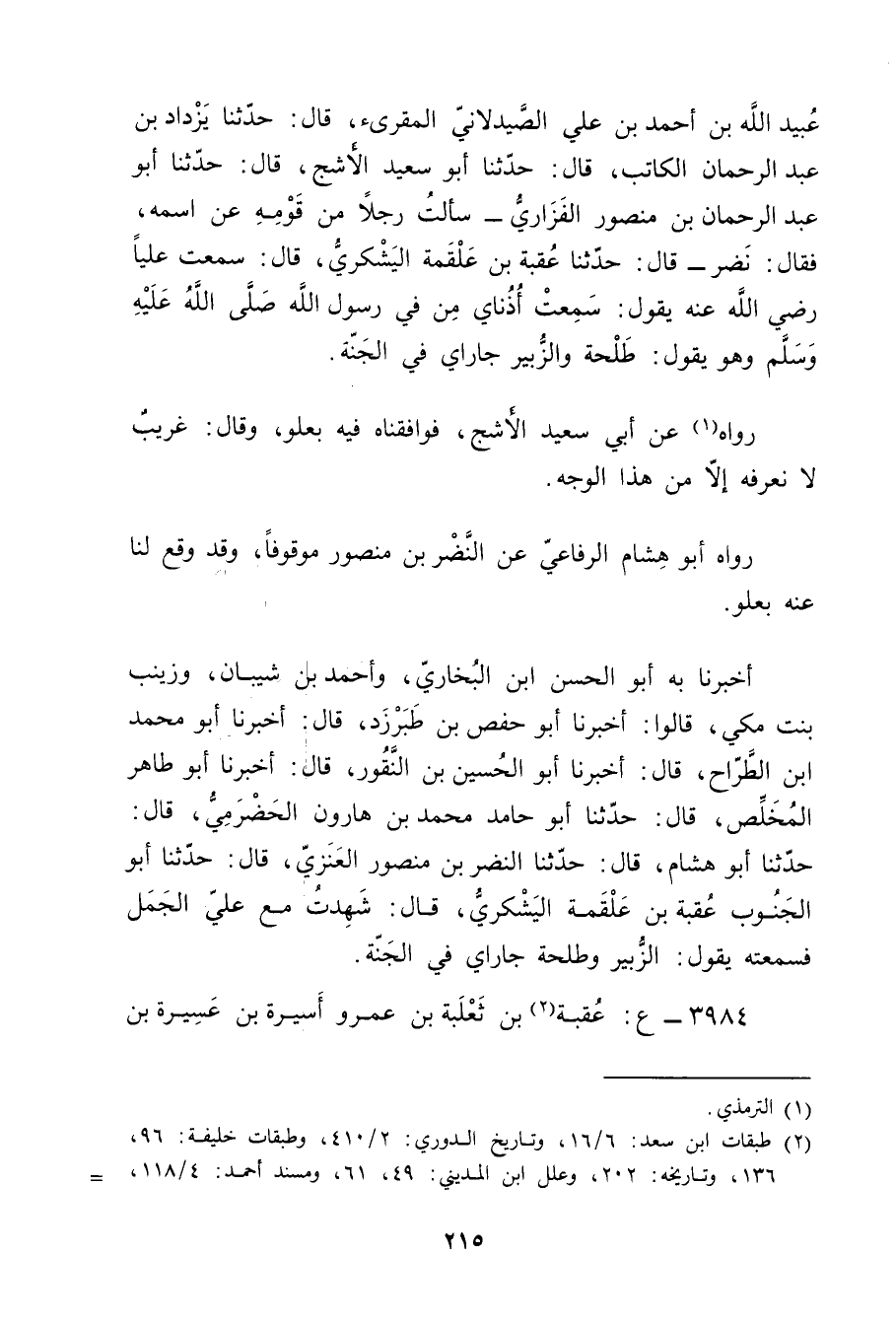 أَخْبَرَنَا بِهِ أَبُو الْحَسَنِ بْن البخاري، وأحمد بْن شيبان، وزَيْنَبُ بِنْتُ مَكِّيٍّ، قَالُوا: أَخْبَرَنَا أبو حفص بن طَبَرْزَذَ، قال: أخبرنا أبو محمد ابن الطَّرَّاحِ، قال: أَخْبَرَنَا أَبُو الْحُسَيْنِ بْن النقور، قال: أَخْبَرَنَا أبو طَاهِرٍ الْمُخَلِّصُ، قال: حَدَّثَنَا أَبُو حامد مُحَمَّد بْن هارون الحضرمي، قال: حَدَّثَنَا أَبُو هِشَامٍ، قال: حَدَّثَنَا النَّضْرُ بْنُ مَنْصُورٍ الْعَنَزِيُّ، قال: حَدَّثَنَا أَبُو الْجَنُوبِ عُقْبَةُ بْنُ عَلْقَمَةَ الْيَشْكُرِيُّ، قال: شَهِدْتُ مَعَ عَلِيٍّ الْجَمَلَ فَسَمِعْتُهُ يَقُولُ: الزُّبَيْرُ وطَلْحَةُ جَارَايَ فِي الْجَنَّةِ.
