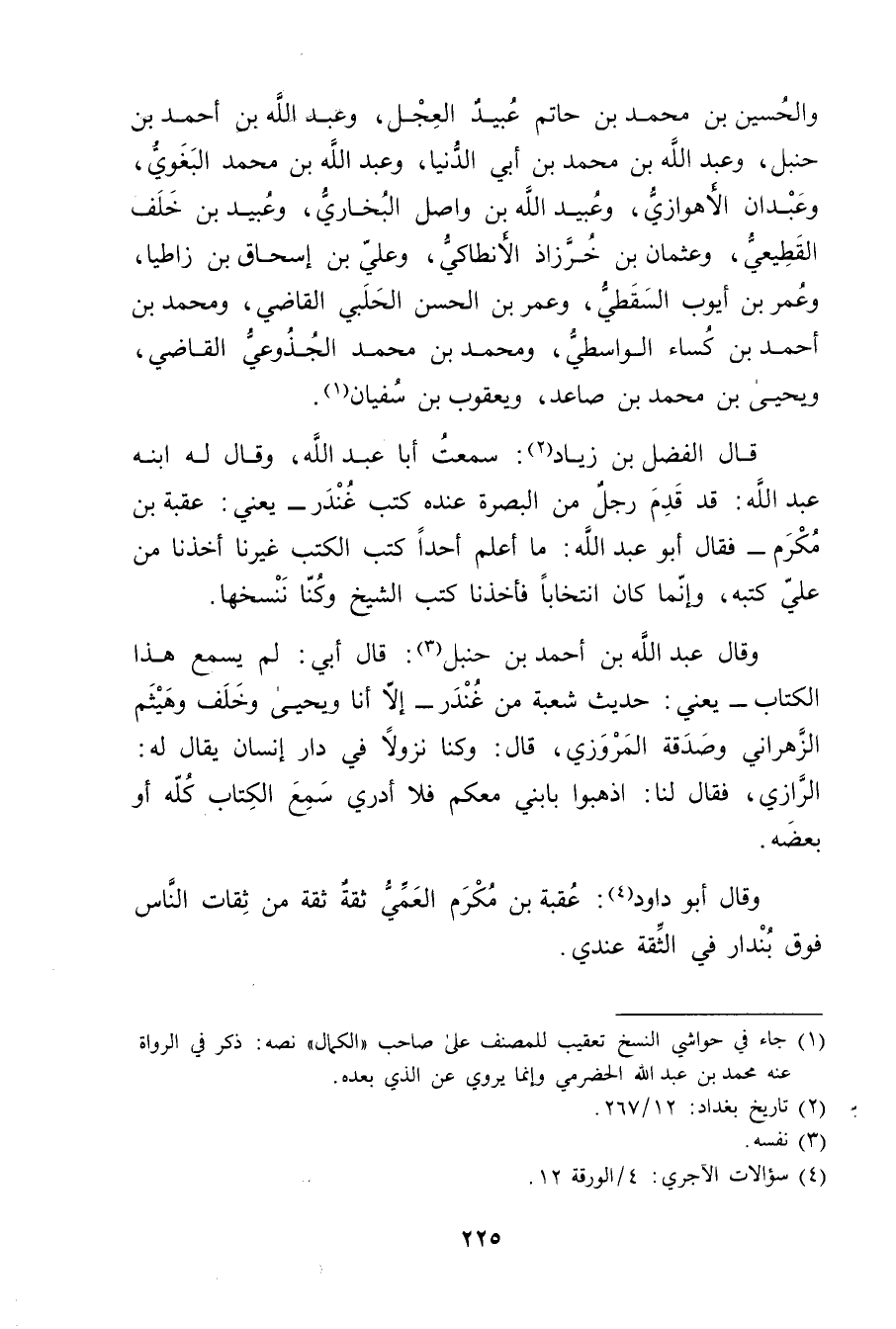قال الفضل بْن زياد (2) : سمعت أبا عَبْد الله، وَقَال له ابنه عبد الله: قد قدم رجل من البصرة عنده كتب غندر، يعني: عقبة بن مكرم - فقال أبو عبد الله: ما أعلم أحدا كتب الكتب غيرنا أخذنا من علي كتبه، وإنما كان انتخابا فأخذنا كتب الشيخ وكنا ننسخها.