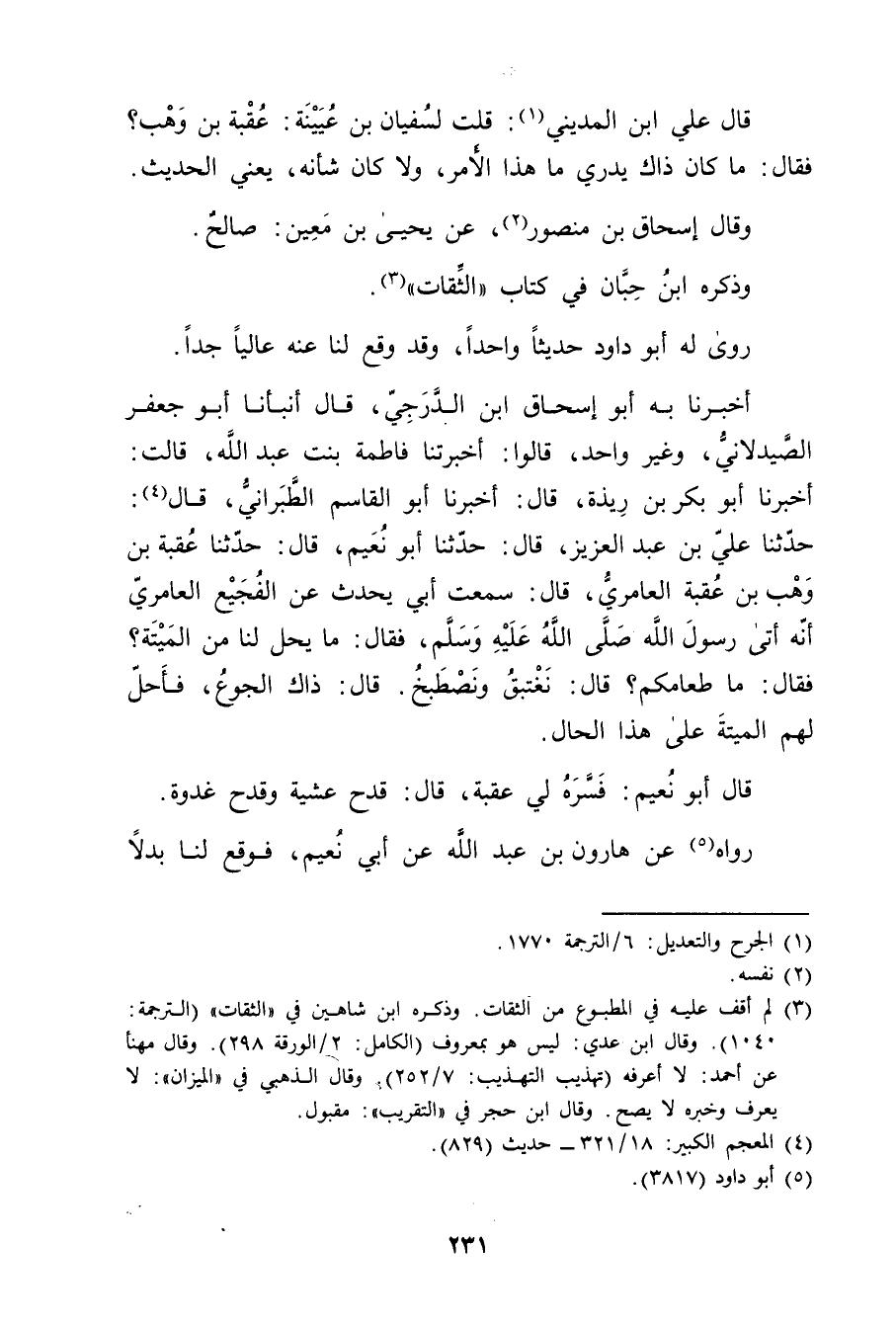 أَخْبَرَنَا بِهِ أَبُو إِسْحَاقَ ابْنُ الدَّرَجِيِّ، قال أَنْبَأَنَا أَبُو جَعْفَرٍ الصَّيْدَلانِيُّ، وغَيْرُ واحِدٍ، قَالُوا: أَخْبَرَتْنَا فَاطِمَةُ بِنْتُ عَبْدِ اللَّهِ، قَالَتْ: أخبرنا أَبُو بَكْرِ بْنُ رِيذَةَ، قال: أخبرنا أَبُو الْقَاسِمِ الطَّبَرَانِيُّ، قال (4) : حَدَّثَنَا عَلِيُّ بْنُ عَبْدِ الْعَزِيزِ، قال: حَدَّثَنَا أَبُو نعيم، قال: حَدَّثَنَا عقبة بن وهب بن عقبة الْعَامِرِيُّ، قال: سَمِعْتُ أَبِي يُحَدِّثُ عَنِ الْفُجَيْعِ الْعَامِرِيِّ أَنَّهُ أَتَى رَسُول اللَّهِ صلى الله عليه وسلم، فَقال: مَا يَحِلُّ لَنَا مِنَ الْمَيْتَةِ؟ فَقال: مَا طَعَامُكُمْ؟ قال: نَغْتَبِقُ ونَصْطَبِخُ. قال: ذَاكَ الْجُوعُ، فَأَحَلَّ لَهَمُ الْمَيْتَةَ عَلَى هَذَا الْحَالِ.