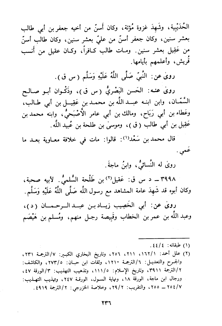 3998 - د س ق: عقيل بن طلحة السلمي (2) . لأبيه صحبة، وكان أبوه قد شهد عامة المشاهد مع رسول اللَّهِ صلى الله عليه وسلم.