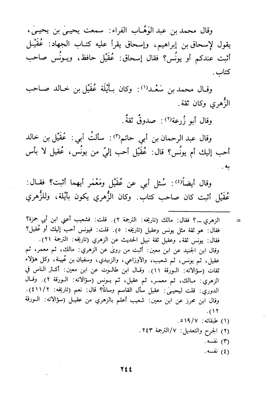 وَقَال عَبْد الرَّحْمَنِ بْن أَبي حَاتِم (3) : سَأَلتُ أبي: عقيل بن خالد أحب إليك أم يونس؟ قال: عقيل أحب إلي من يونس، عقيل لا بأس به.