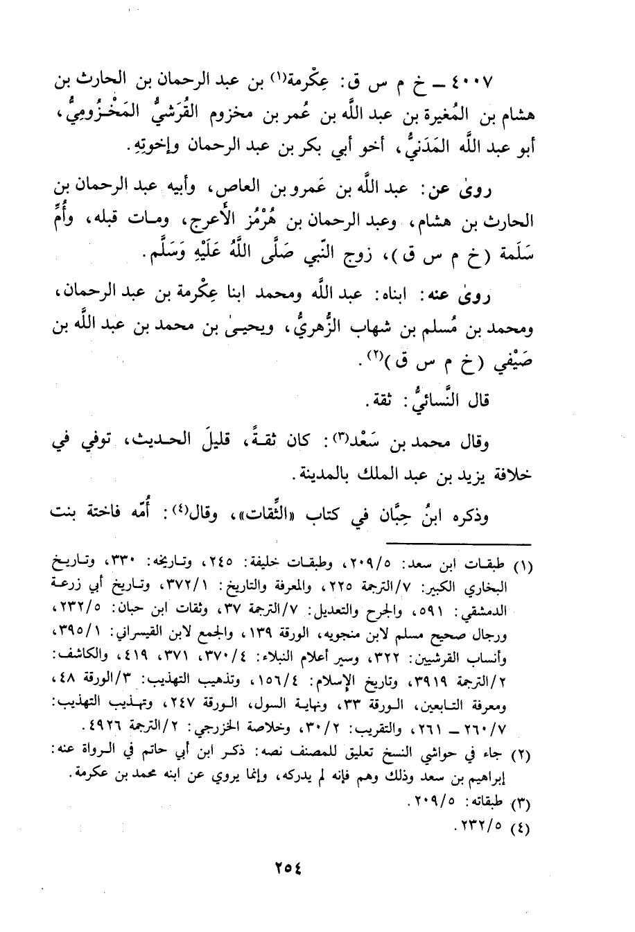 4007 - خ م س ق: عكرمة بن عَبْد الرَّحْمَنِ بْن الحارث بْن هشام بن المغيرة بن عَبْدِ الله بْن عُمَر بْن مخزوم القرشي المخزومي (1) ، أَبُو عَبْد اللَّهِ المدني، أَخُو أَبِي بَكْر بْن عبد الرحمن وإخوته.