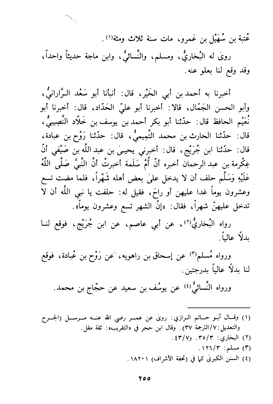 أَخْبَرَنَا بِهِ أَحْمَد بْن أَبي الخير، قال: أَنْبَأَنَا أَبُو سَعْدٍ الرَّارَانِيُّ، وأَبُو الحسن الجمال، قالا: أَخْبَرَنَا أَبُو عَلِيّ الحداد، قال: أَخْبَرَنَا أَبُو نُعَيْمٍ الْحَافِظُ قال: حَدَّثَنَا أَبُو بَكْرٍ أَحْمَدُ بْنُ يُوسُفَ بْنِ خَلادٍ النَّصِيبِيُّ، قال: حَدَّثَنَا الْحَارِثُ بْنُ مُحَمَّدٍ التَّمِيمِيُّ، قال: حَدَّثَنَا روح بن عبادة رَوْحُ بْنُ عُبَادَةَ، قال: حَدَّثَنَا ابْنِ جُرَيْج، قال: أَخْبَرَنِي يَحْيَى بْن عَبْد اللَّهِ بْن صيفي أَنَّ عِكْرِمَةَ بْنِ عَبْدِ الرَّحْمَنِ أَخْبَرَهُ أَنَّ أُمَّ سَلَمَةَ أَخْبَرَتْ أَنَّ النَّبِيَّ صلى الله عليه وسلم حَلَفَ أَنْ لا يَدْخُلَ عَلَى بَعْضِ أَهْلِهِ شَهْرًا، فَلَمَّا مَضَتْ تِسْعٌ وعِشْرُونَ يَوْمًا غَدَا عَلَيْهِنَّ أَوْ رَاحَ، فَقِيلَ لَهُ: حَلَفْتَ يَا نَبِيَّ اللَّهِ أَنْ لا تَدْخُلَ عَلَيْهِنَّ شَهْرًا، فَقال: إِنَّ الشَّهْرَ تِسْعٌ وعِشْرُونَ يَوْمًا.