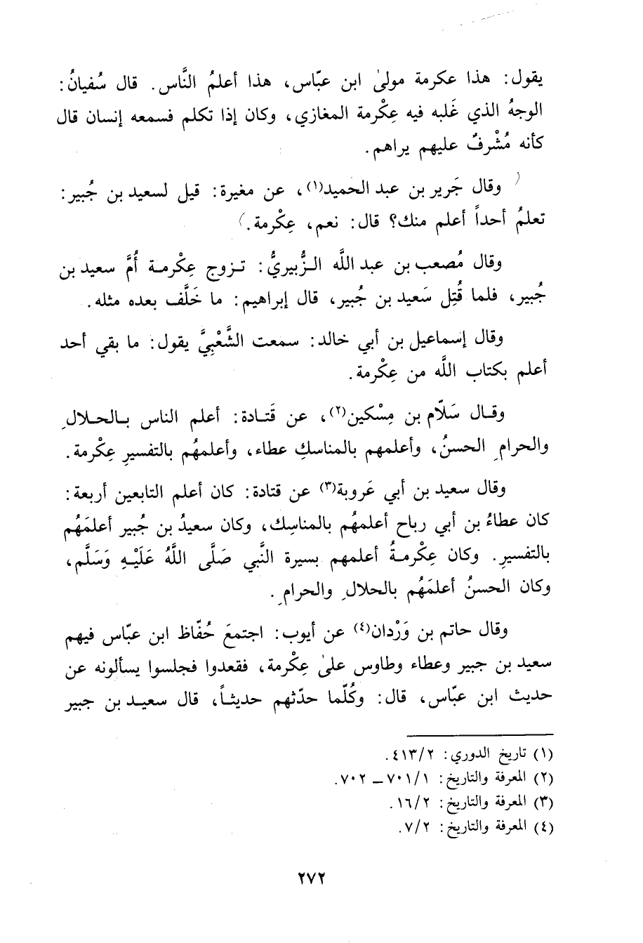 وَقَال سَعِيد بن أَبي عَرُوبَة (3) عن قتادة: كان أعلم التابعين أربعة: كان عطاء بن أَبي رباح أعلمهم بالمناسك، وكان سَعِيد بن جبير أعلمهم بالتفسير. وكان عكرمة أعلمهم بسيرة النبي صَلَّى اللَّهُ عَلَيْهِ وسَلَّمَ، وكَانَ الحسن أعلمهم بالحلال والحرام.