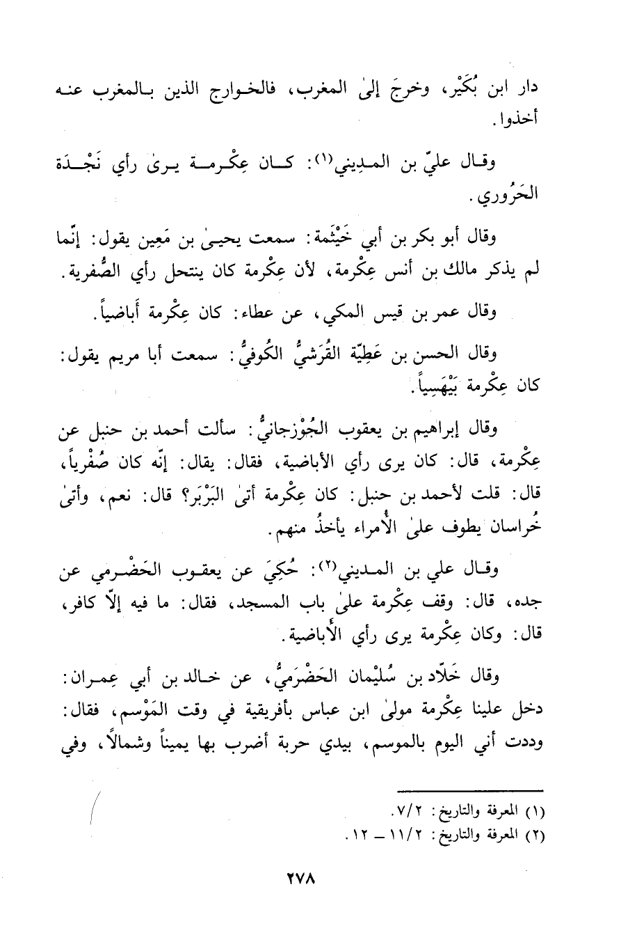 وَقَال علي بن المديني (2) : حكي عن يعقوب الحضرمي عن جده، قال: وقف عكرمة على باب المسجد، فقال: ما فيه إلا كافر، قال: وكان عكرمة يرى رأي الإباضية.