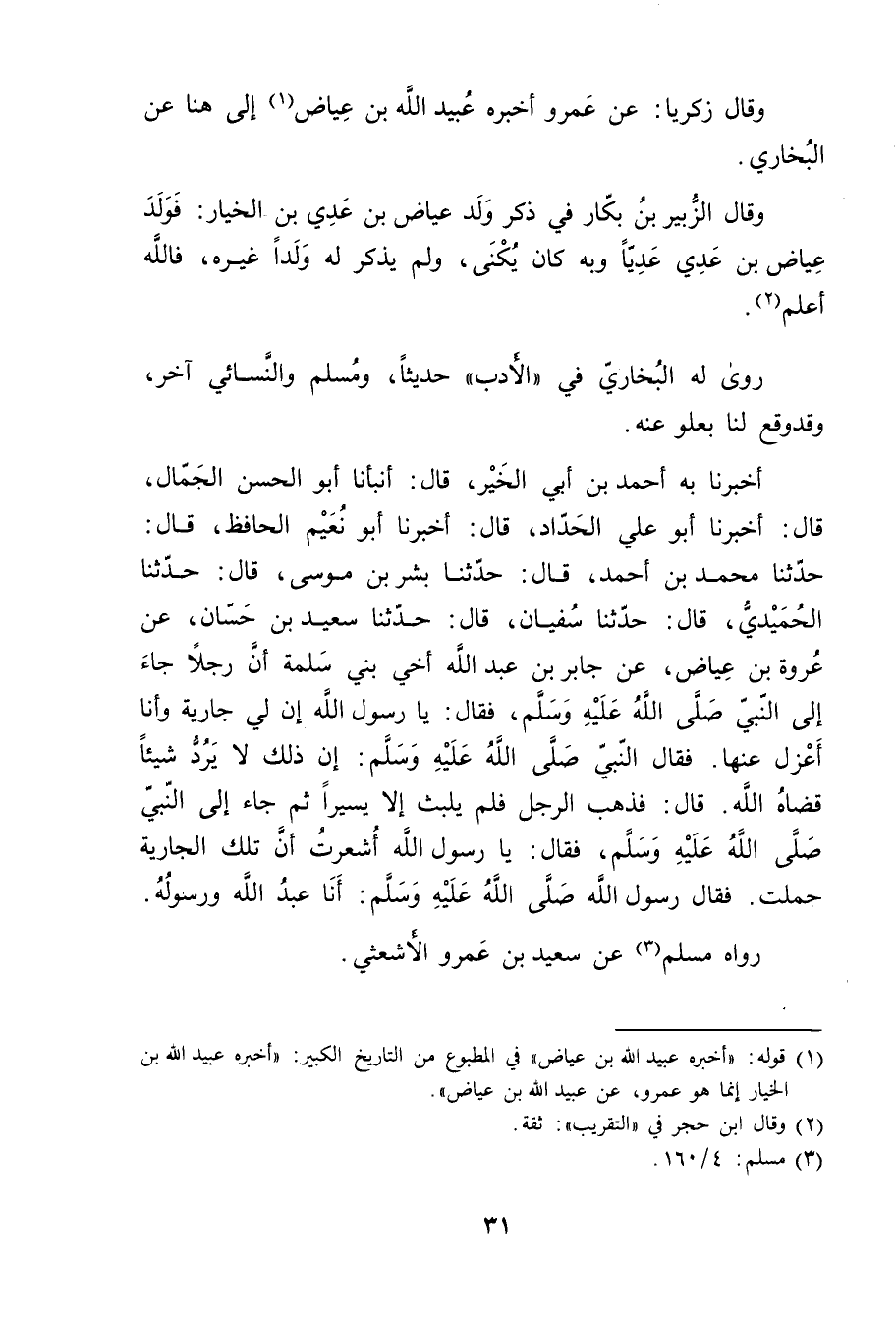 أَخْبَرَنَا بِهِ أَحْمَد بْن أَبي الخير، قال: أَنْبَأَنَا أَبُو الْحَسَنِ الْجَمَّالُ، قال: أَخْبَرَنَا أَبُو عَلِيّ الحداد، قال: أَخْبَرَنَا أَبُو نُعَيْمٍ الْحَافِظُ، قال: حَدَّثَنَا مُحَمَّد بْن أَحْمَدَ، قال: حَدَّثَنَا بشر بْن موسى، قال: حَدَّثَنَا الحميدي، قال: حَدَّثَنَا سُفْيَانُ، قال: حَدَّثَنَا سَعِيد بْنُ حسان، عن عروة بن عياض، عَنْ جَابِرِ بْنِ عَبْدِ اللَّهِ أَخِي بَنِي سَلَمَةَ أَنَّ رَجُلا جاء إِلَى النَّبِيّ صَلَّى اللَّهُ عَلَيْهِ وسَلَّمَ، فقَالَ: يا رَسُول اللَّهِ إِنَّ لِي جَارِيَةً وأَنَا أَعْزِلُ عَنْهَا. فَقال النَّبِيُّ صلى الله عليه وسلم: إِنَّ ذَلِكَ لا يَرُدُّ شَيْئًا قَضَاهُ اللَّهُ. قال: فَذَهَبَ الرَّجُلُ فَلَمْ يَلْبَثْ إِلا يَسِيرًا ثُمَّ جَاءَ إِلَى النَّبِيُّ صلى الله عليه وسلم، فَقال: يَا رَسُولَ اللَّهِ أُشْعِرْتُ أَنْ تِلْكَ الْجَارِيَةِ حَمَلَتْ. فَقال رَسُول اللَّهِ صلى الله عليه وسلم: أَنَا عَبْدُ اللَّهِ ورَسُولُهُ.
