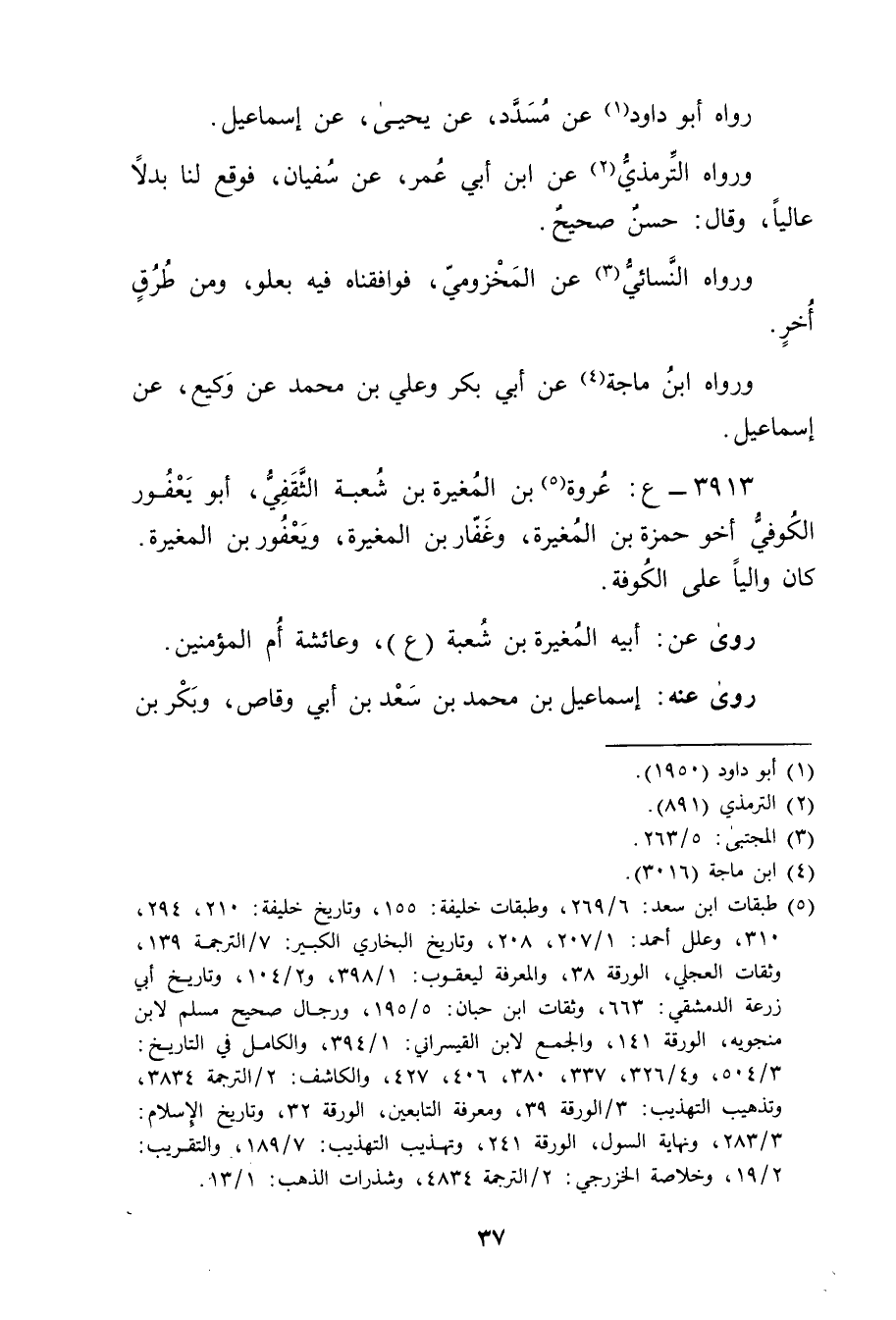 3913 - ع: عروة بن المغيرة بن شعبة الثقفي (5) ، أبو يعفور الكوفي أخو حمزة بن المغيرة، وغفار بن المغيرة، ويعفور بن المغيرة. كان واليا على الكوفة.