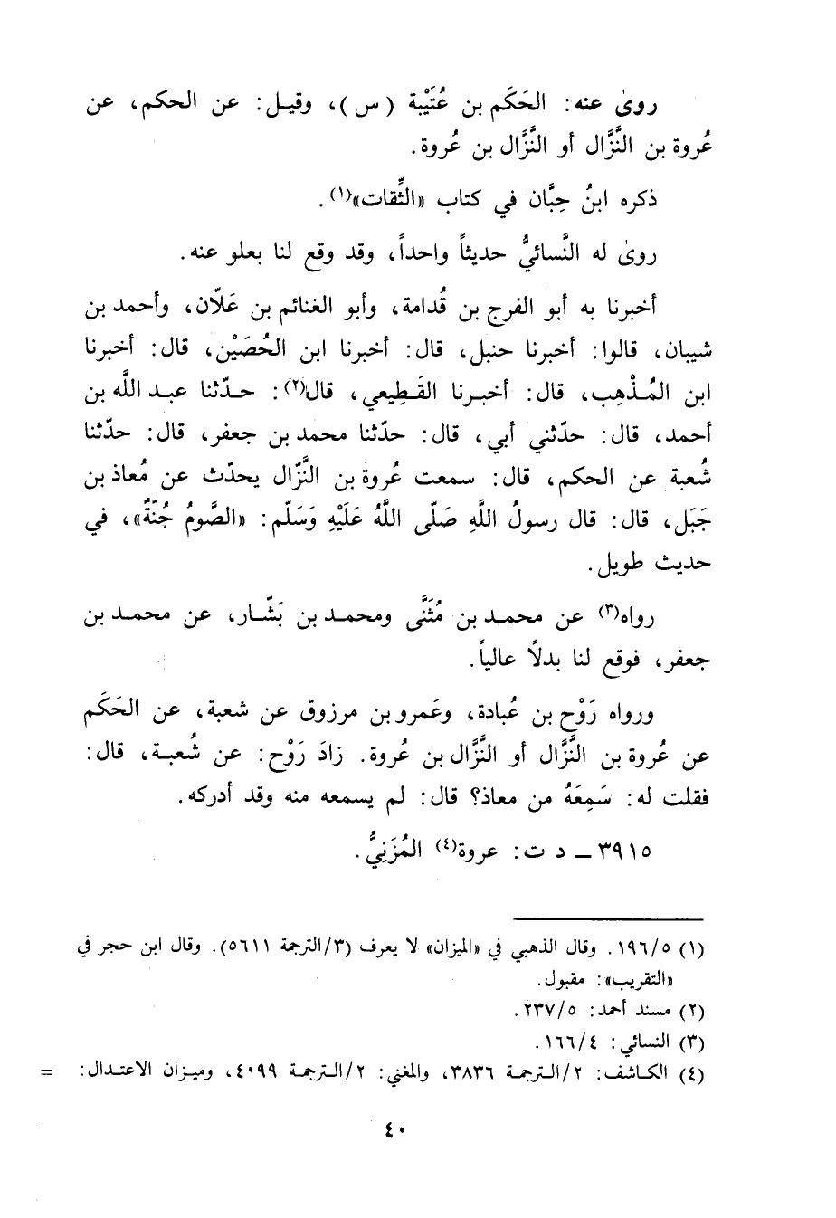 أَخْبَرَنَا بِهِ أَبُو الْفَرَجِ بْنُ قُدَامَةَ، وأَبُو الْغَنَائِمِ بْن علان، وأحمد بْن شيبان، قَالُوا: أخبرنا حنبل، قال: أخبرنا ابْنُ الْحُصَيْنِ، قال: أخبرنا ابْنُ الْمُذْهِب، قال: أخبرنا القَطِيعِيّ، قال (2) : حَدَّثَنَا عَبْدُ اللَّهِ بْنُ أَحْمَدَ، قال: حَدَّثني أبي، قال: حَدَّثَنَا مُحَمَّدُ بْنُ جَعْفَرٍ، قال: حَدَّثَنَا شُعْبَةُ عَنِ الْحَكَمِ، قال: سَمِعْتُ عُرْوَةَ بْنَ النَّزَّالِ يُحَدِّثُ عَنْ مُعَاذِ بْنِ جَبَلٍ، قال: قال رَسُول اللَّهِ صلى الله عليه وسلم: الصَّوْمُ جُنَّةٌ"، فِي حَدِيثٍ طَوِيلٍ.