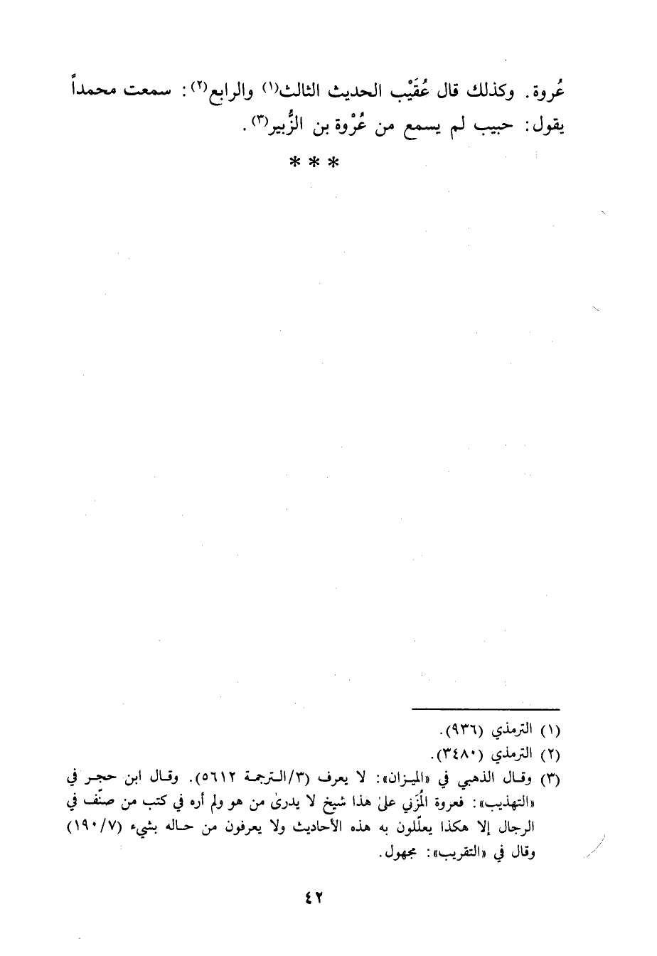 عروة. وكذلك قال عقيب الحديث الثالث (1) والرابع (2) : سمعت محمدا يقول: حبيب لم يسمع من عروة بن الزبير (3) .