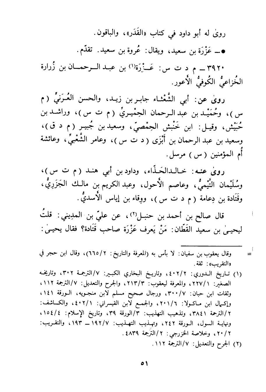 3920 - م د ت س: عزرة بن عبد الرحمن بن زرارة الخزاعي الكوفي الأَعور (1) .