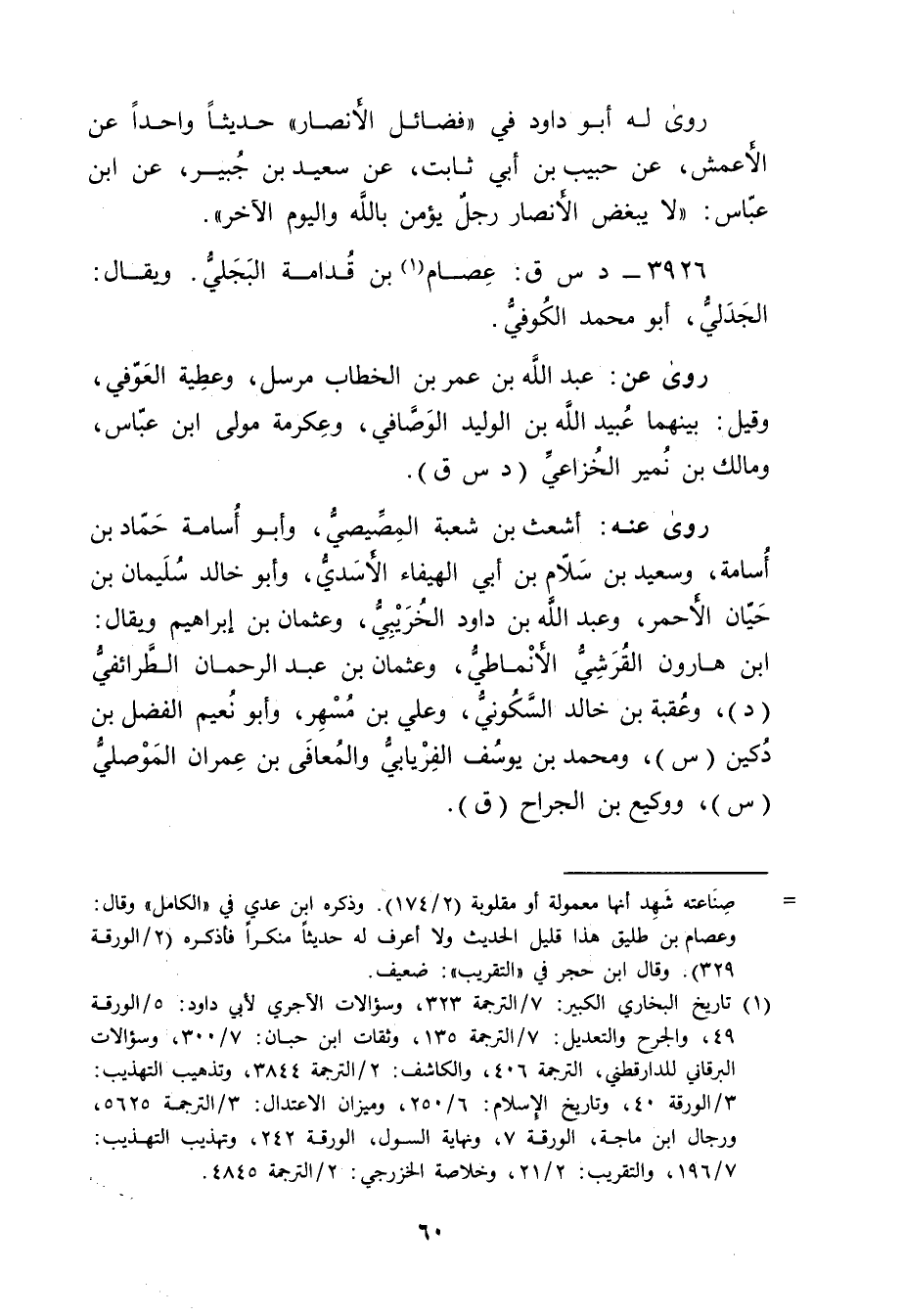 3926 - د س ق: عصام بن قدامة البجلي (1) . ويُقال: الجدلي، أَبُو مُحَمَّد الكوفي.