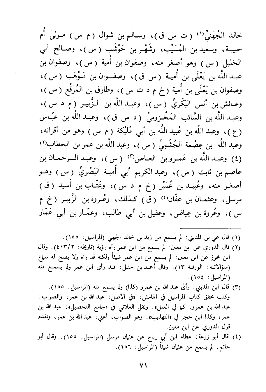 (2) قال الدوري عن ابن مَعِين: لم يسمع من ابن عُمَر رآه رؤية (تاريخه: 2 / 403) . وَقَال ابن محرز عن ابن مَعِين: لم يسمع من ابْن عُمَر شيئا ولكنه قد رآه ولا يصح له سماع (سؤالاته: الورقة 13) . وَقَال أحمد بن حنبل: قد رأى ابن عُمَر ولم يسمع منه (المراسيل: 154) .