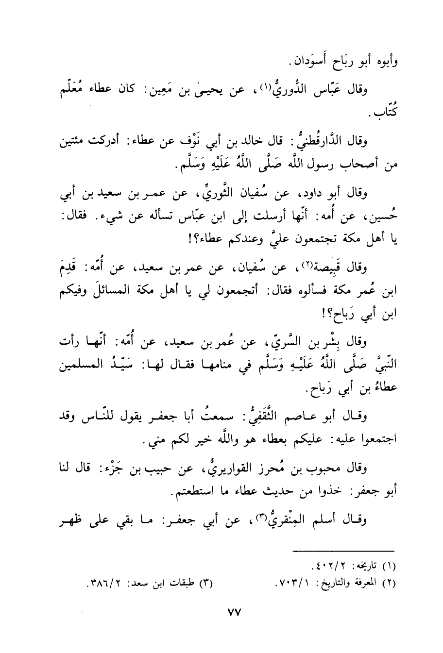وَقَال أَبُو داود، عن سفيان الثوري، عن عُمَر بْنِ سَعِيد بن أَبي حسين، عن أُمِّه: أنها أرسلت إلى ابن عباس تسأله عن شئ. فقال: يا أهل مكة تجتمعون علي وعندكم عطاء؟ ! وَقَال قبيصة (2) ، عن سفيان عن عُمَر بن سَعِيد، عن أُمِّه: قدم ابن عُمَر مكة فسألوه فقال: أتجمعون لي يا أهل مكة المسائل وفيكم ابن أَبي رباح؟ !