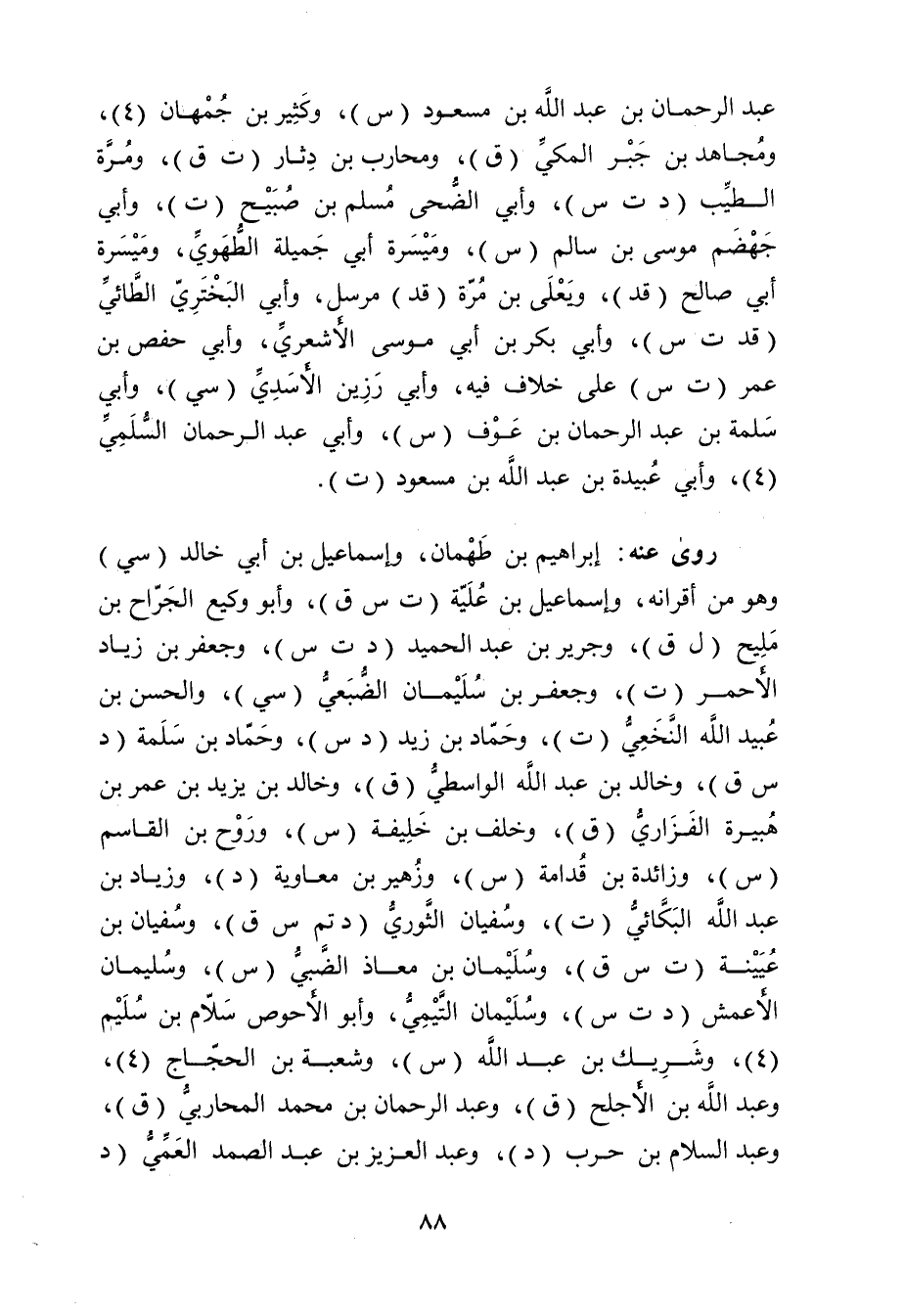 عَبْد الرَّحْمَنِ بْن عَبْد اللَّهِ بن مسعود (س) ، كثيربن جمهان (4) ، ومجاهد بْن جبر المكي (ق) ، ومحارب بْن دثار (ت ق) ، ومرة الطيب (د ت س) ، وأبي الضحى مسلم بْن صبيح (ت) ، وأبي جهضم موسى بن سالم (س) ، وميسرة أبي جميلة الطهوي، وميسرة أبي صالح (قد) ، ويَعْلَى بن مرة (قد) مرسل، وأبي البختري الطائي (قد ت س) ، وأَبِي بَكْرِ بْن أَبي موسى الأشعري، وأبي حفص بن عُمَر (ت س) على خلاف فيه، وأبي رزين الأسدي (سي) ، وأبي سلمة بْن عَبْد الرحمن بن عوف (س) ، وأبي عبد الرحمن السلمي (4) ، وأبي عُبَيدة بن عَبْد اللَّهِ بْن مَسْعُود (ت) .