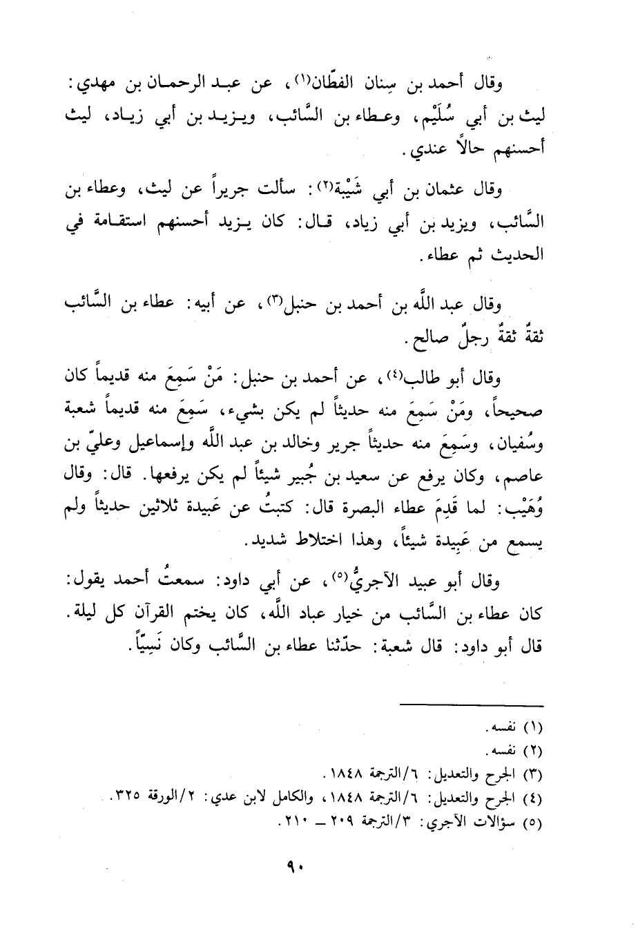 وَقَال أَبُو عُبَيد الآجري (5) ، عَن أبي داود: سمعت أحمد يقول: كان عطاء بن السائب من خيار عباد الله، كان يختم القرآن كل ليلة. قال أبو داود: قال شعبة: حَدَّثَنَا عطاء بن السائب وكان نسيا.