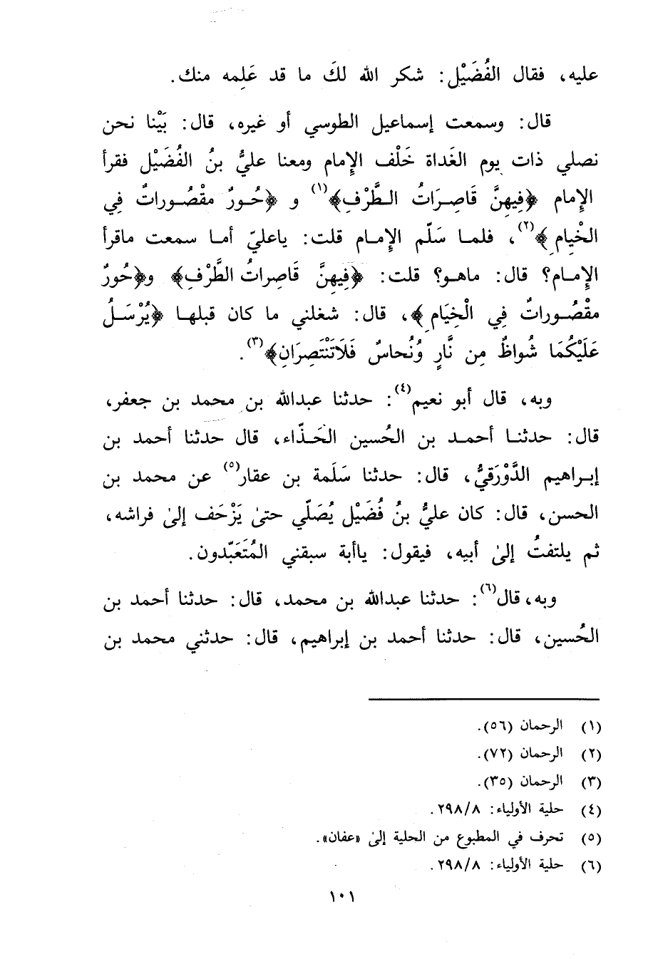 قال: وسمعت إسماعيل الطوسي أو غيره، قال: بينا نحن نصلي ذات يوم الغداة خلف الإمام ومعنا علي بْن الفضيل فقرأ الإمام (فيهن قاصرات الطرف) (1) و (حور مقصورات فِي الخيام) (2) ، فلما سلم الإمام قُلْتُ: يا علي أما سمعت ما قرأ الإمام؟ قال: ما هُوَ؟ قُلْتُ: (فيهن قاصرات الطرف) و (حور مقصورات فِي الخيام) ، قال: شغلني ما كَانَ قبلها (يرسل عليكما شواظ من نار ونحاس فلا تنتظران) (3) .