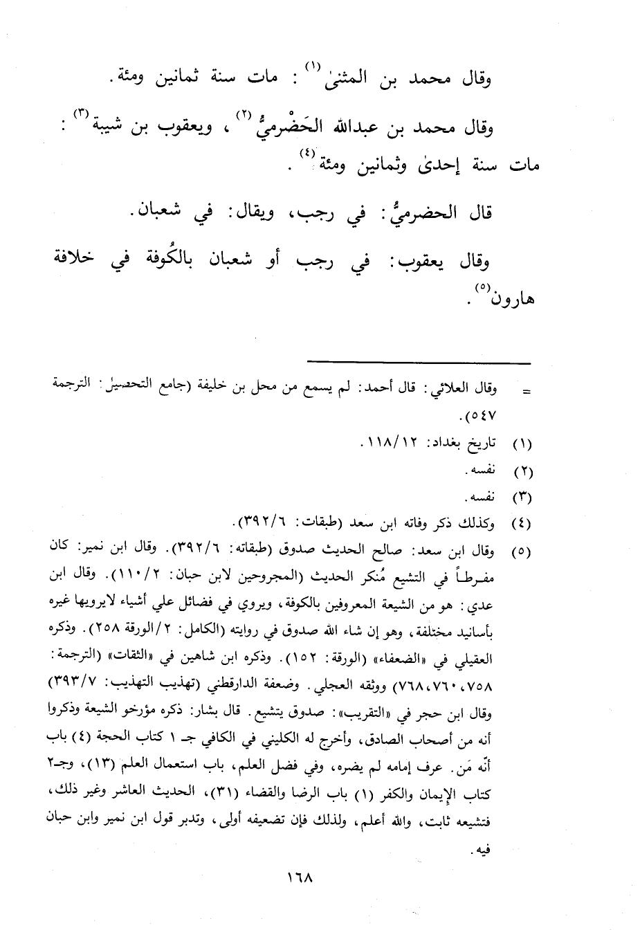 (5) وَقَال ابن سعد: صالح الحديث صدوق (طبقاته: 6 / 392) . وَقَال ابن نمير: كان مفرطا في التشيع منكر الحديث (المجروحين لابن حبان: 2 / 110) . وَقَال ابن عدي: هو من الشيعة المعروفين بالكوفة، ويروي في فضائل علي أشياء لا يرويها غيره بأسًانيد مختلفة، وهو إن شاء الله صدوق في روايته (الكامل: 2 / الورقة 258) ، وذَكَره العقيلي في "الضعفاء " (الورقة: 152) ، وذَكَره ابن شاهين في "الثقات" (الترجمة: 758، 760، 768) ووثقه العجلي. وضعفه الدارقطني (تهذيب التهذيب: 7 / 393) وَقَال ابن حجر في "التقريب": صدوق يتشيع. قال بشار: ذكره مؤرخو الشيعة وذكروا أنه من أصحاب الصادق، وأخرج له الكليني في الكافي ج 1 كتاب الحجة (4) باب أنه من. عرف إمامه لم يضره، وفي فضل العلم، باب استعمال العلم (13) ، وج 2 كتاب الايمان والكفر (1) باب الرضا والقضاء (31) ، الحديث العاشر وغير ذلك، فتشيعه ثابت، والله أعلم، ولذلك فإن تضعيفه أولى، وتدبر قول ابن نمير وابن حبان فيه.