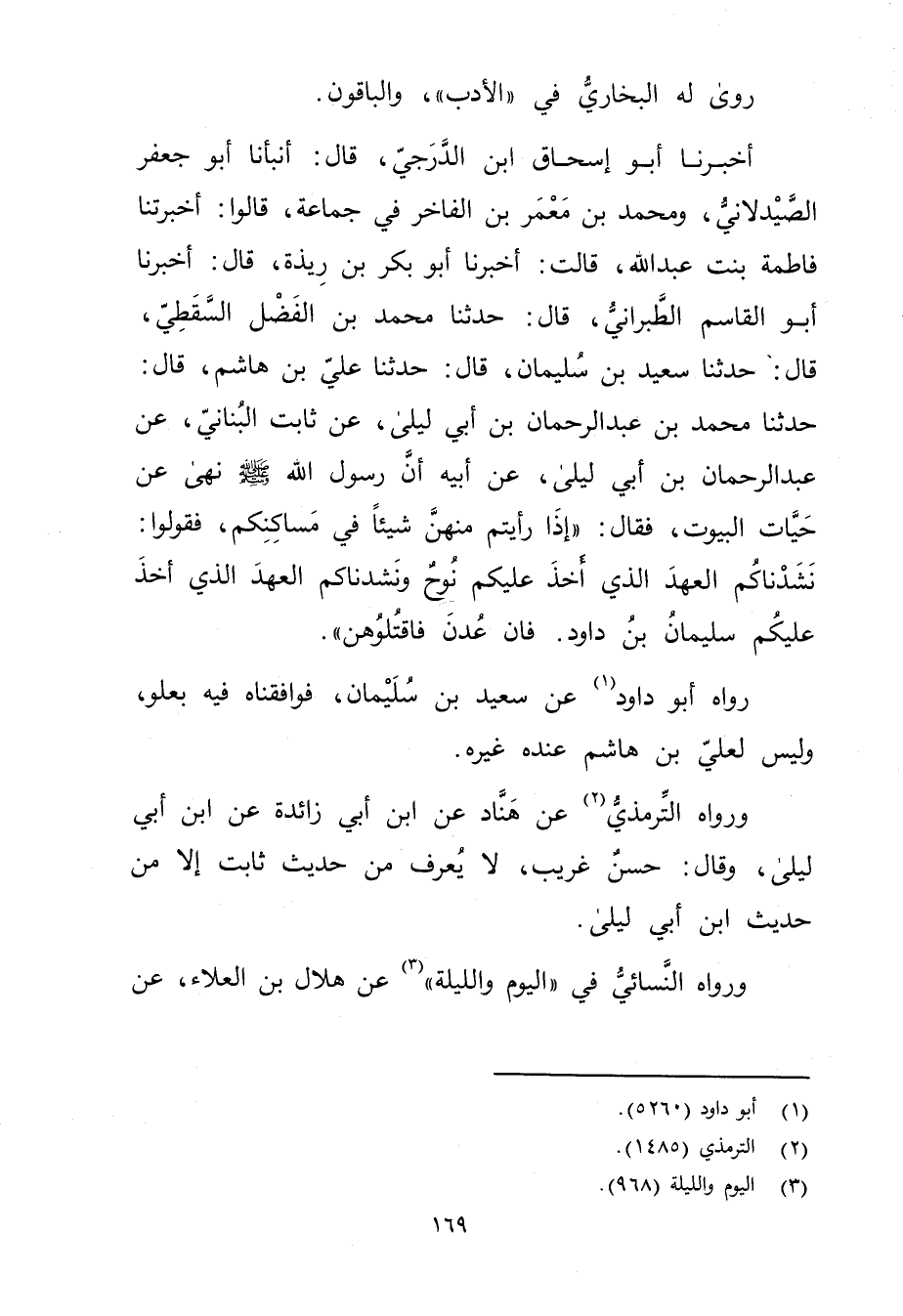 أَخْبَرَنَا أَبُو إِسْحَاقَ ابْنُ الدَّرَجِيِّ، قال: أَنْبَأَنَا أَبُو جَعْفَرٍ الصَّيْدَلانِيُّ، ومُحَمَّدُ بْنُ مَعْمَرِ بْنِ الْفَاخِرِ فِي جَمَاعَةٍ، قَالُوا: أَخْبَرَتْنا فَاطِمَةُ بِنْتُ عَبد اللَّهِ، قَالَتْ: أخبرنا أَبُو بَكْرِ بْنُ رِيذَةَ، قال: أخبرنا أَبُو الْقَاسِمِ الطَّبَرَانِيُّ، قال: حَدَّثَنَا مُحَمَّد بْن الفضل السقطي، قال: حَدَّثَنَا سَعِيد بْنُ سُلَيْمان، قال: حَدَّثَنَا عَلِيُّ بْنُ هَاشِمٍ، قال: حَدَّثَنَا مُحَمَّد بْن عَبْد الرحمن بْنِ أَبي لَيْلَى، عن ثَابِتٍ الْبُنَانِيِّ، عن عَبْدِ الرَّحْمَنِ بْنِ أَبي لَيْلَى، عَن أَبِيهِ أَنَّ رَسُول اللَّهِ صلى الله عليه وسَلَّمَ نَهَى عن حَيَّاتِ الْبُيُوتِ، فقال: "إذا رأيتم منهم شَيْئًا فِي مَسَاكِنِكُمْ، فَقُولُوا