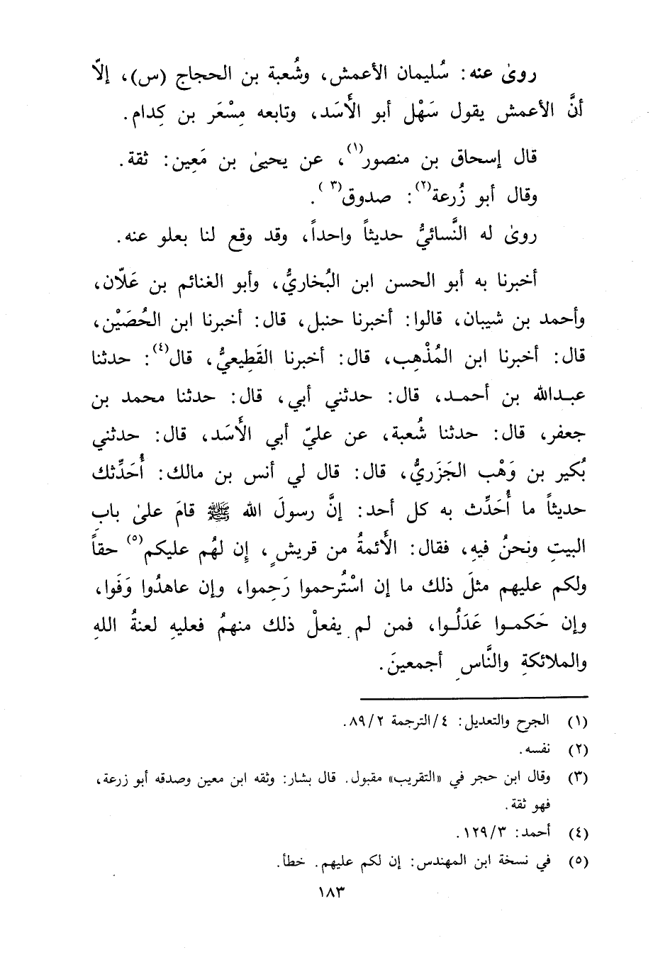 أَخْبَرَنَا بِهِ أَبُو الْحَسَنُ بْنُ الْبُخَارِيِّ، وأَبُو الْغَنَائِمِ بْن علان، وأحمد بْن شيبان، قَالُوا: أخبرنا حنبل، قال: أخبرنا ابْنُ الْحُصَيْنِ، قال: أخبرنا ابْنُ الْمُذْهِب، قال: أخبرنا القَطِيعِيّ، قال (4) : حَدَّثَنَا عَبد اللَّهِ بْنُ أَحْمَدَ، قال: حَدَّثني أبي، قال: حَدَّثَنَا مُحَمَّدُ بْنُ جَعْفَرٍ، قال: حَدَّثَنَا شُعْبَةُ، عن عَلِيٍّ أَبِي الأَسَدِ، قال: حَدَّثَنِي بُكَيْرُ بْنُ وهْبٍ الْجَزَرِيُّ، قال: قال لِي أَنَسُ بْنُ مَالِكٍ: أُحَدِّثُكَ حَدِيثًا مَا أُحَدِّثُ بِهِ كُلَّ أَحَدٍ: أَنَّ رَسُول اللَّهِ صلى الله عليه وسَلَّمَ قَامَ عَلَى بَابِ الْبَيْتِ ونَحْنُ فِيهِ، فَقَالَ: الأَئِمَّةُ مِنْ قُرَيْشٍ، إِنَّ لَهُمْ عَلَيْكُمْ (5) حَقًّا ولَكُمْ عَلَيْهِمْ مِثْلَ ذَلِكَ مَا إِنِ اسْتُرْحِمُوا رَحِمُوا، وإِنْ عَاهَدُوا وفَوْا، وإِنْ حَكَمُوا عَدَلُوا، فَمَنْ لَمْ يَفْعَلْ ذَلِكَ مِنْهُمْ فَعَلَيْهِ لعنة اللَّه والملائكة والناس أجمعين.