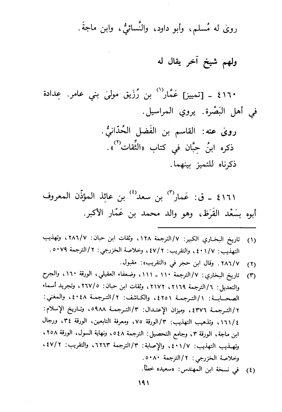 4161 - ق: عمار بن سعد (3) بن عائذ المؤذن المعروف أبوه بسعد القرظ (4) ، وهو والد محمد بن عمار الاكبر.